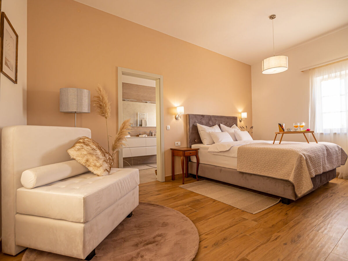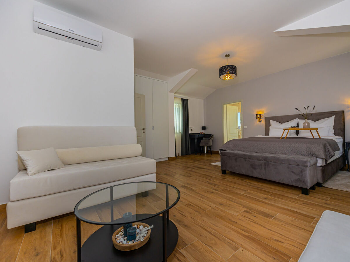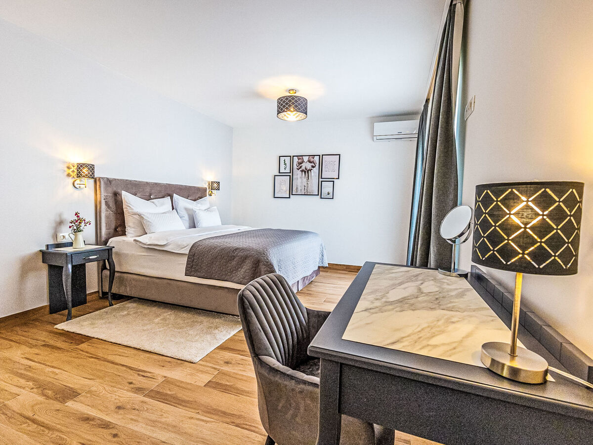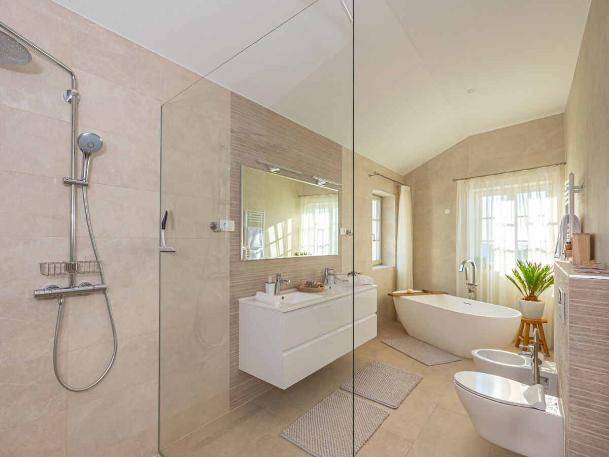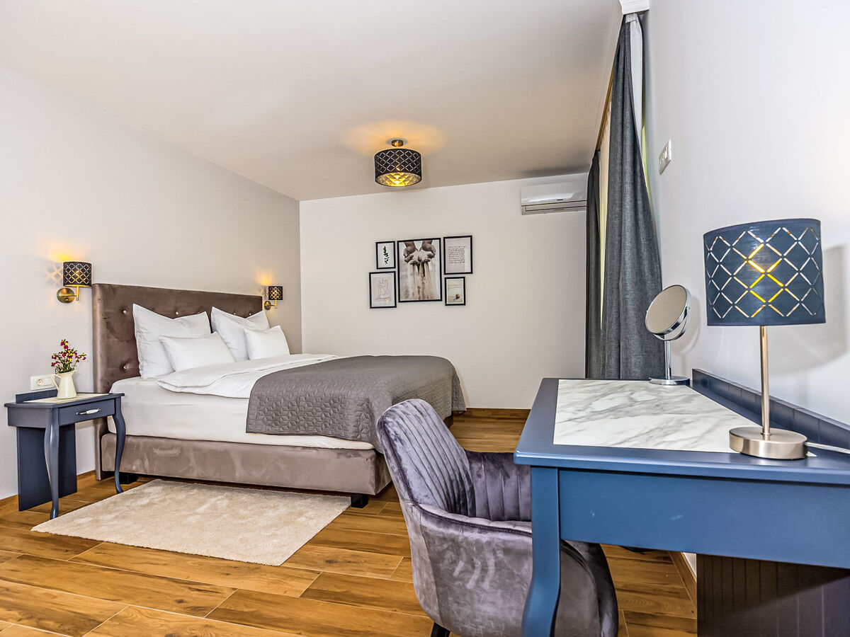 1 chambre avec 1 lit double (2 x 90 cm, longueur 200 cm), bain/douche/bidet/WC.