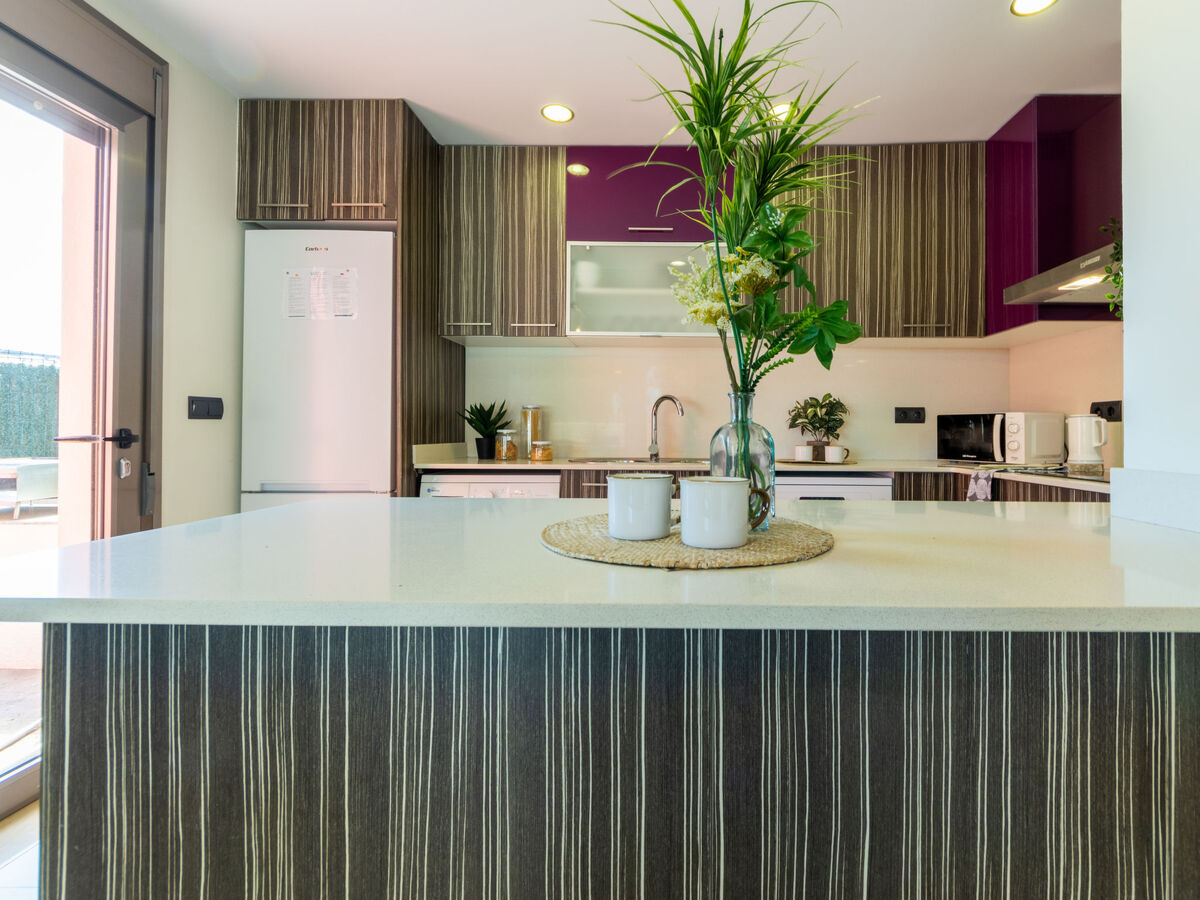 Cuisine ouverte (four, lave-vaisselle, 3 plaques vitrocéramiques, grille-pain, bouilloire électrique, micro-ondes, congélateur, cafetière électrique) avec bar.
