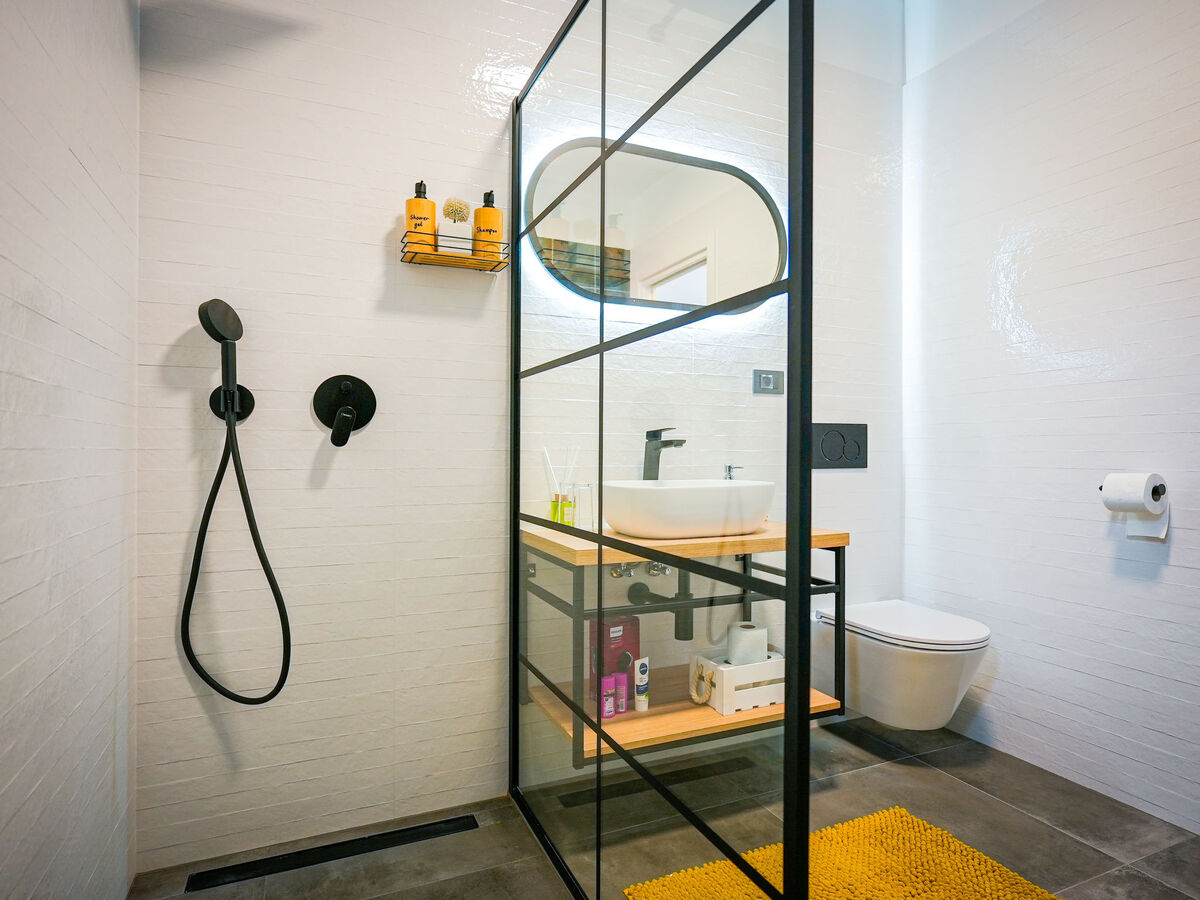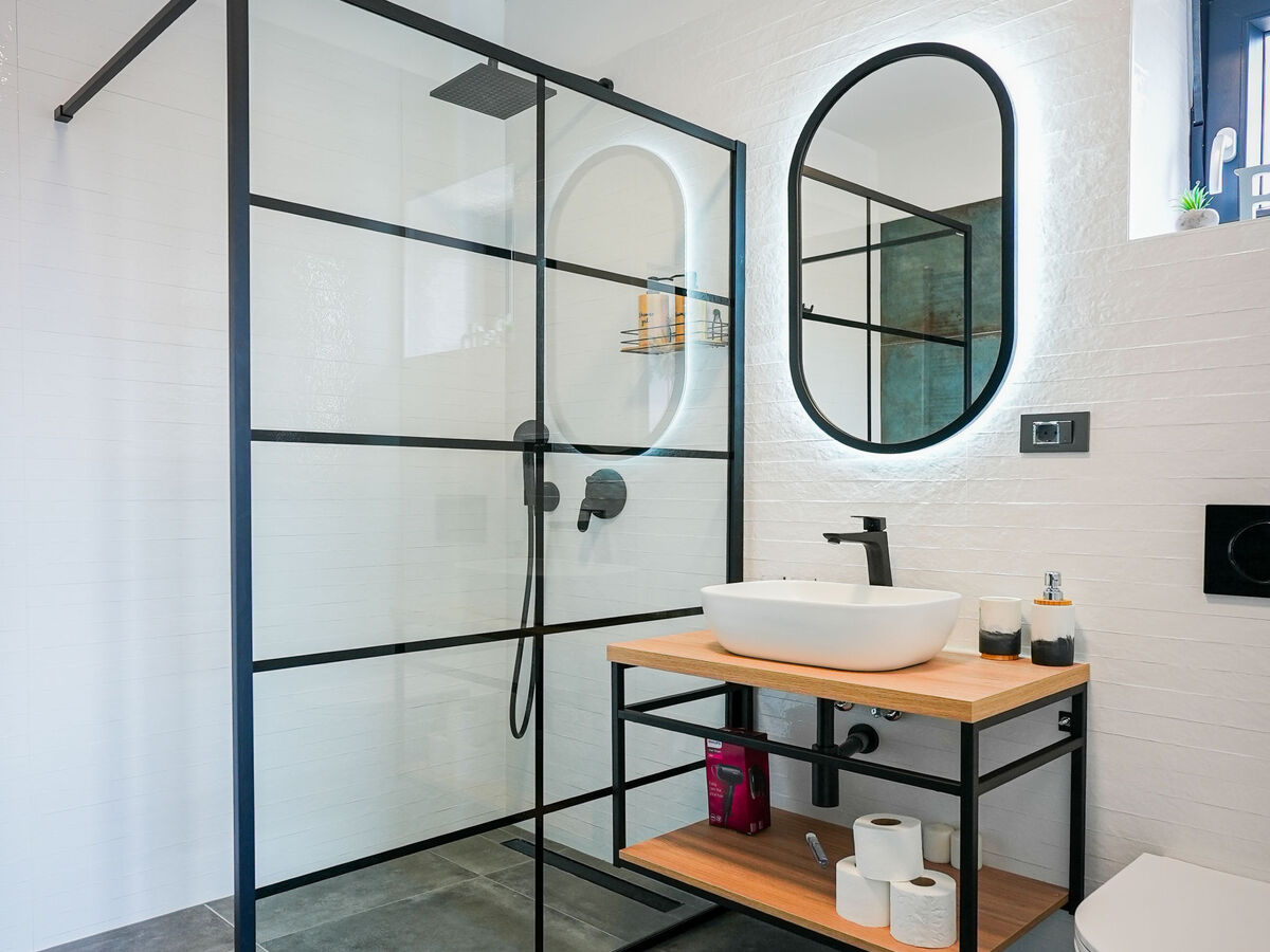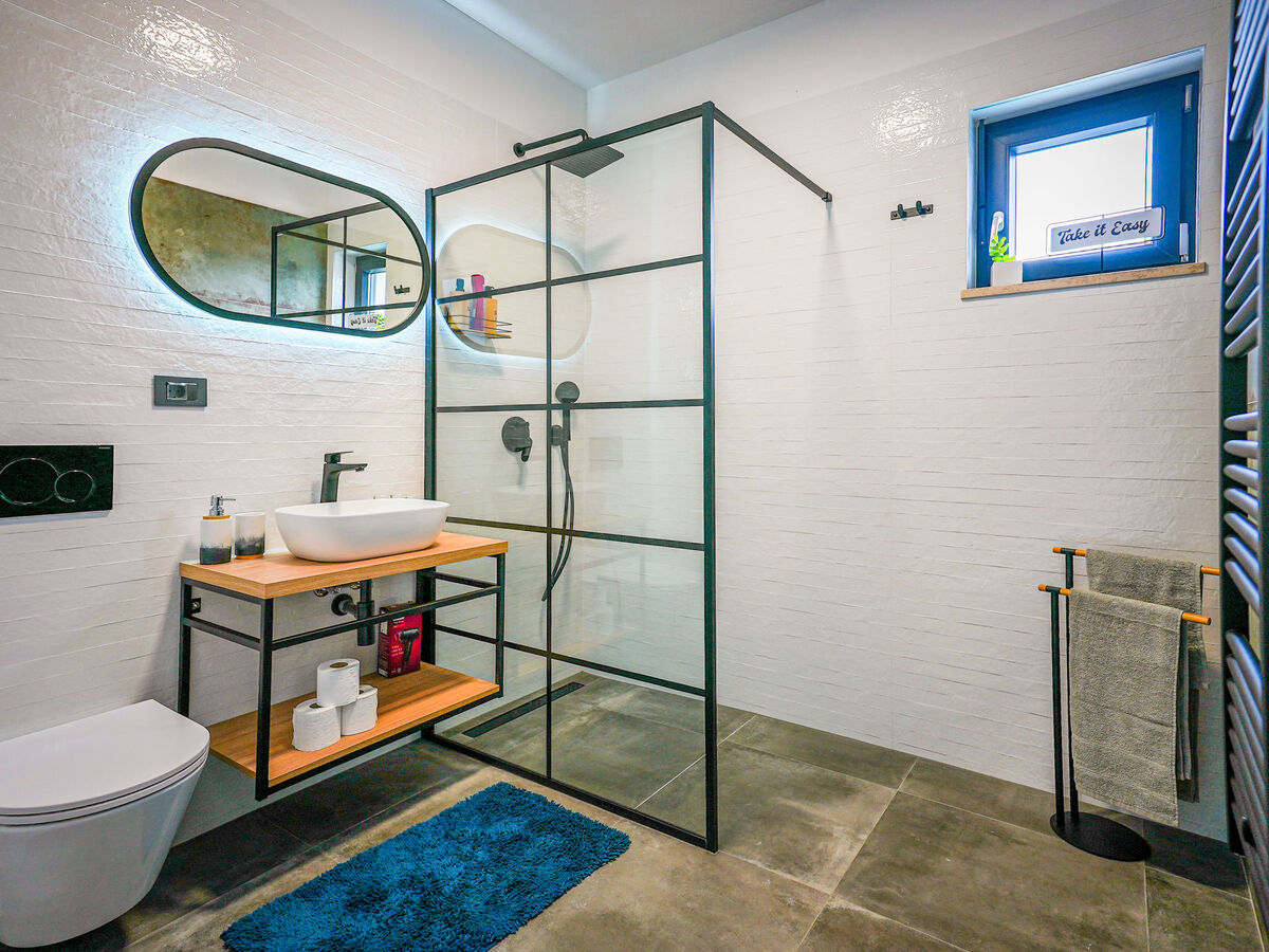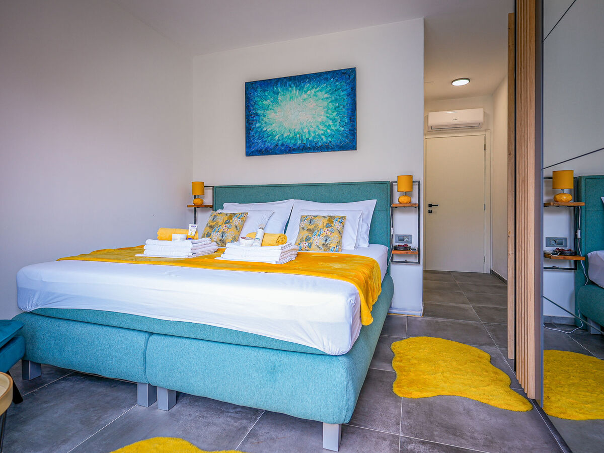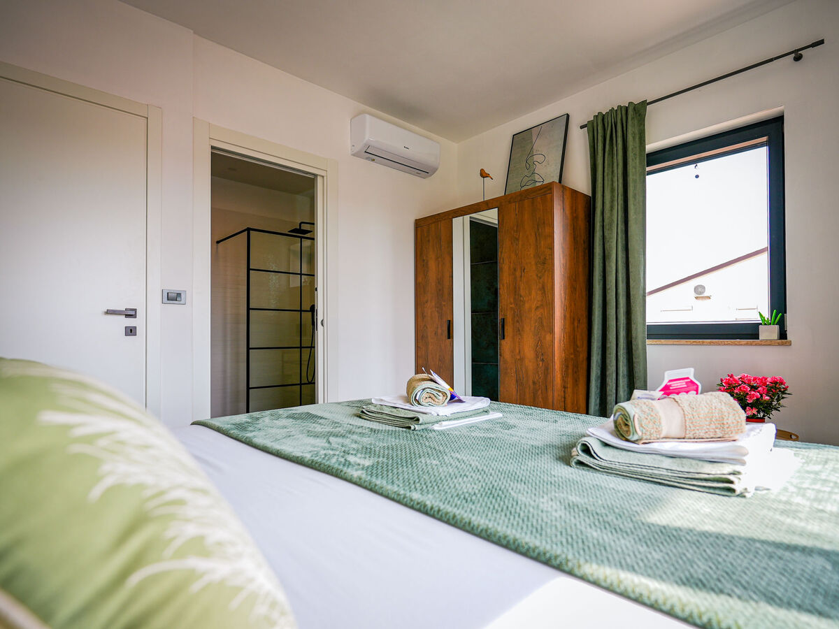 1 chambre avec 1 grand-lit (180 cm, longueur 200 cm), douche/WC et air-conditionné.