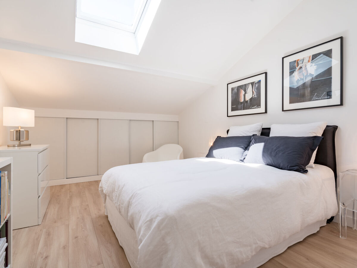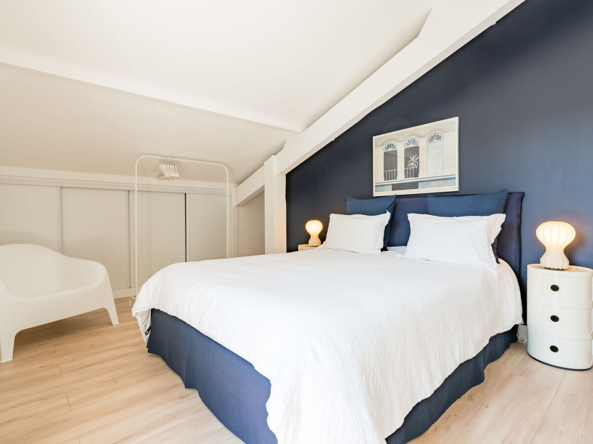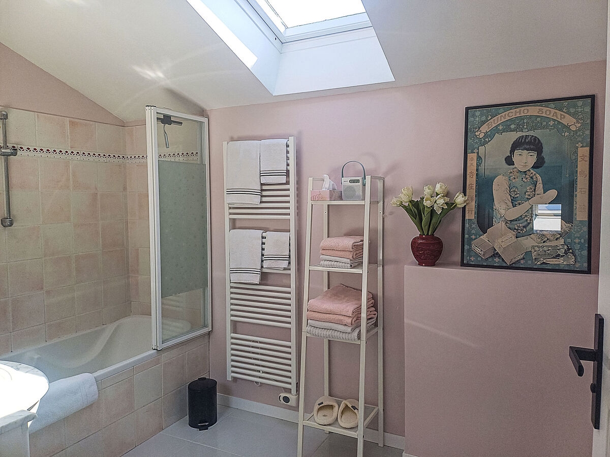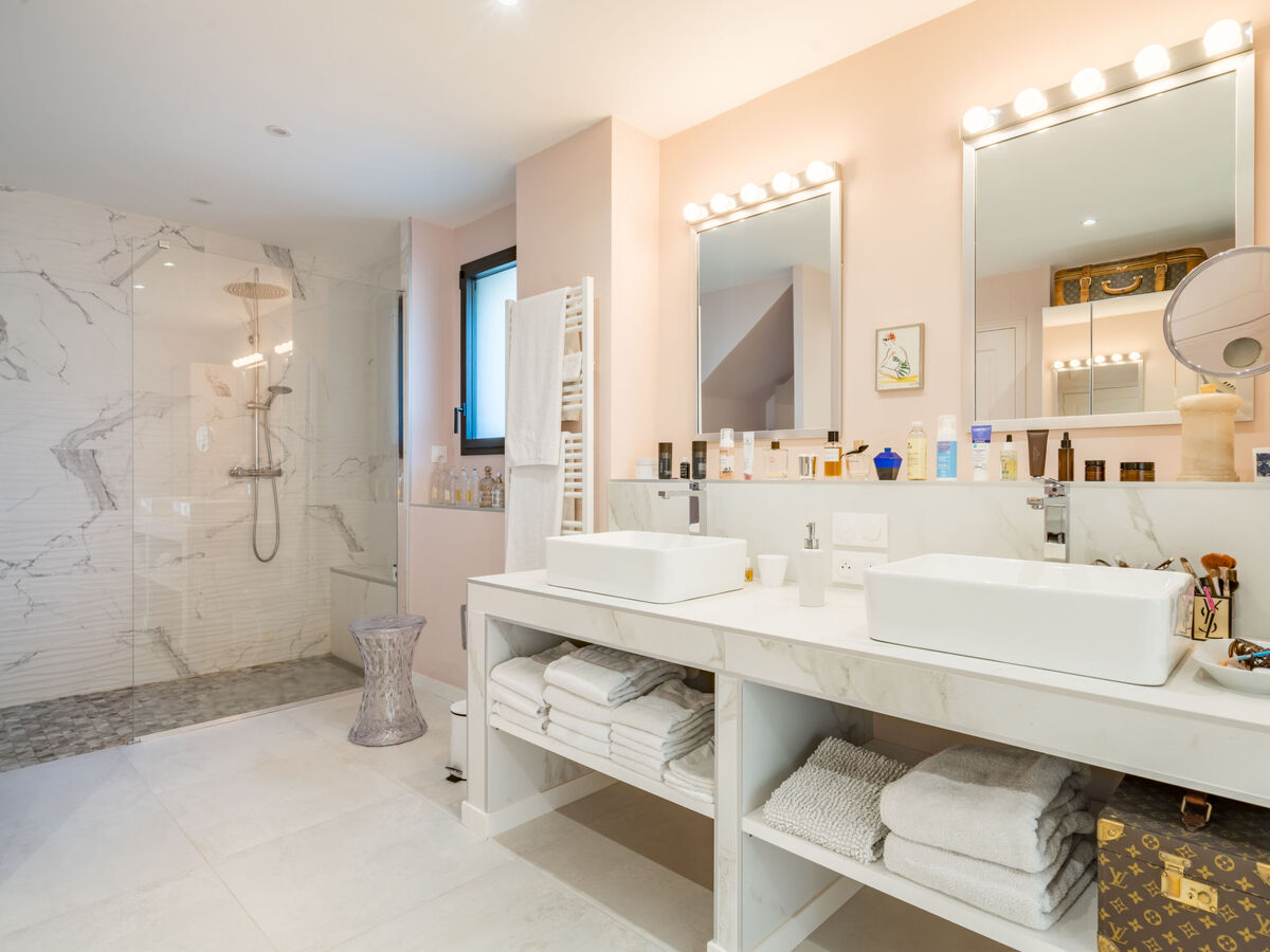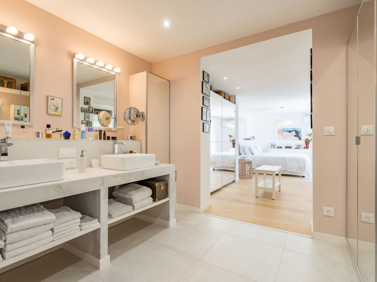 1 chambre avec 1 grand-lit (160 cm, longueur 200 cm), douche et double vasque.
