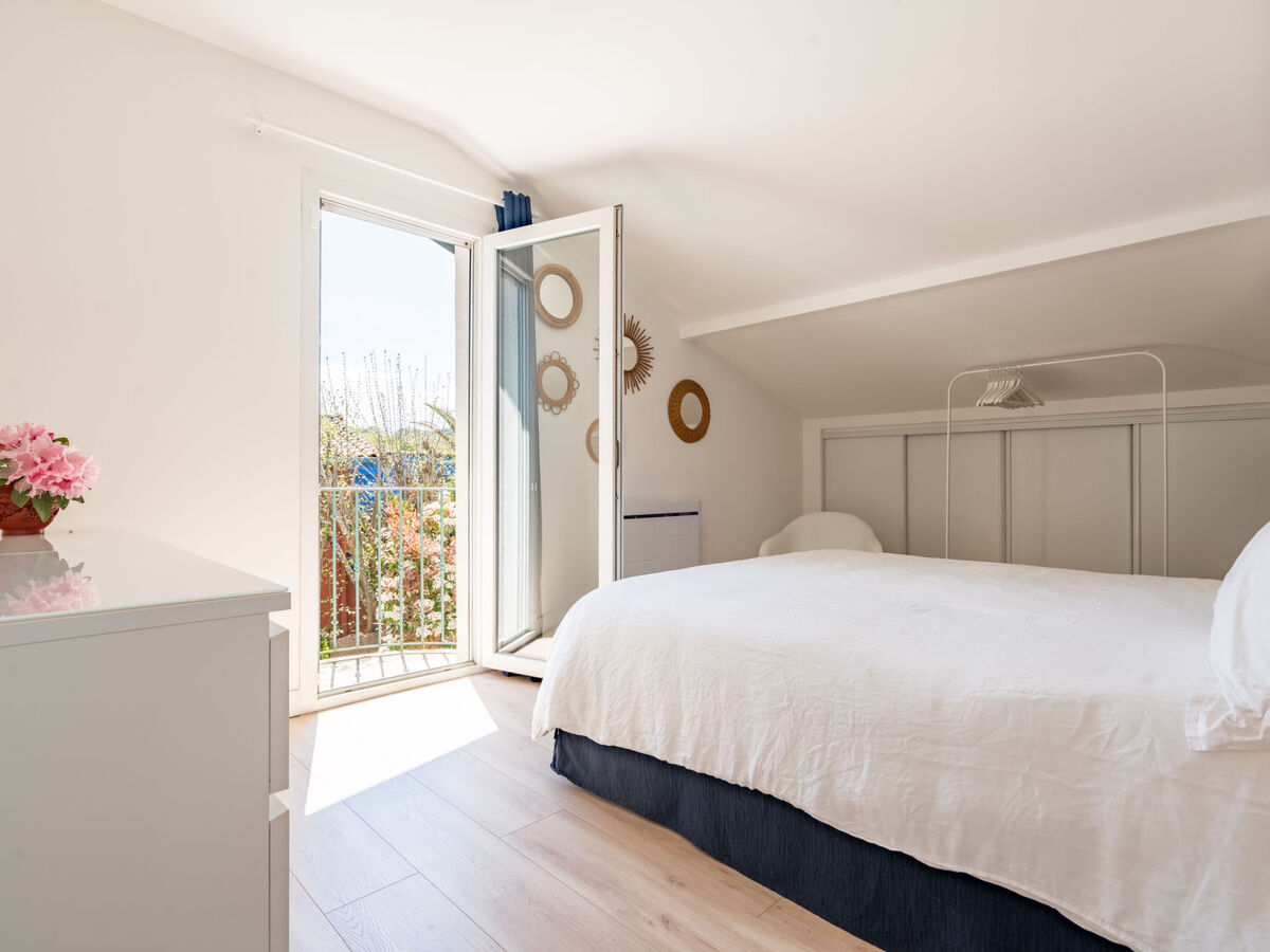 À l'étage supérieur: 1 chambre avec 1 grand-lit (160 cm, longueur 200 cm).