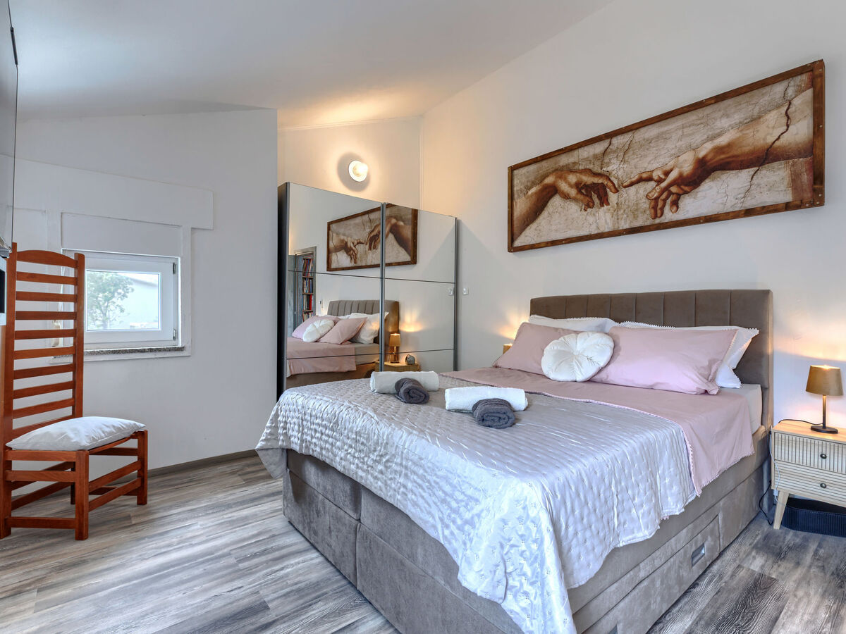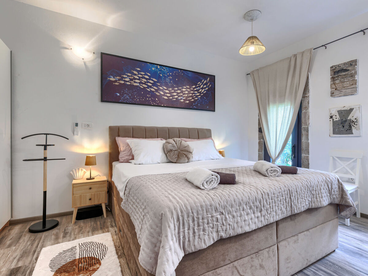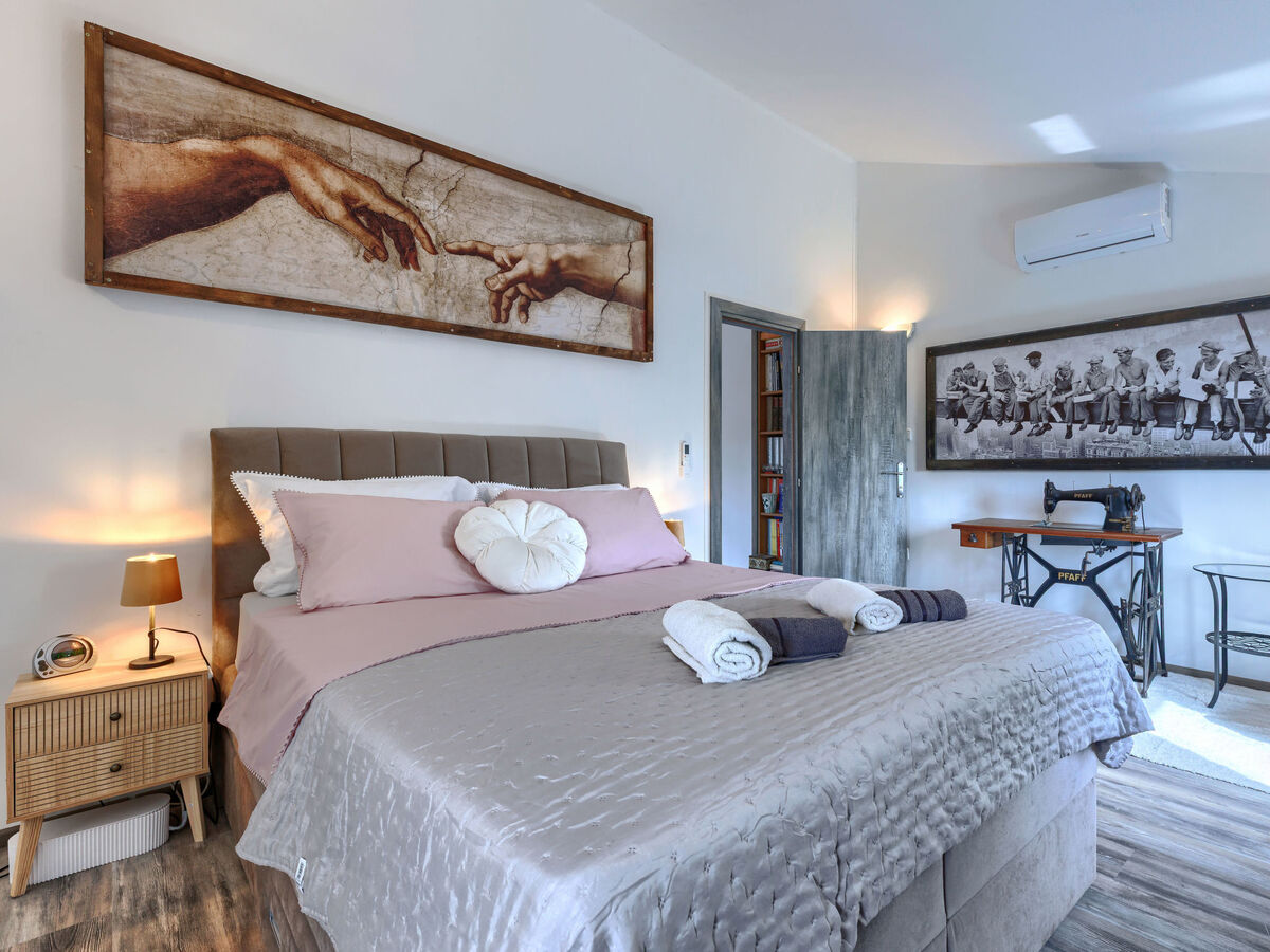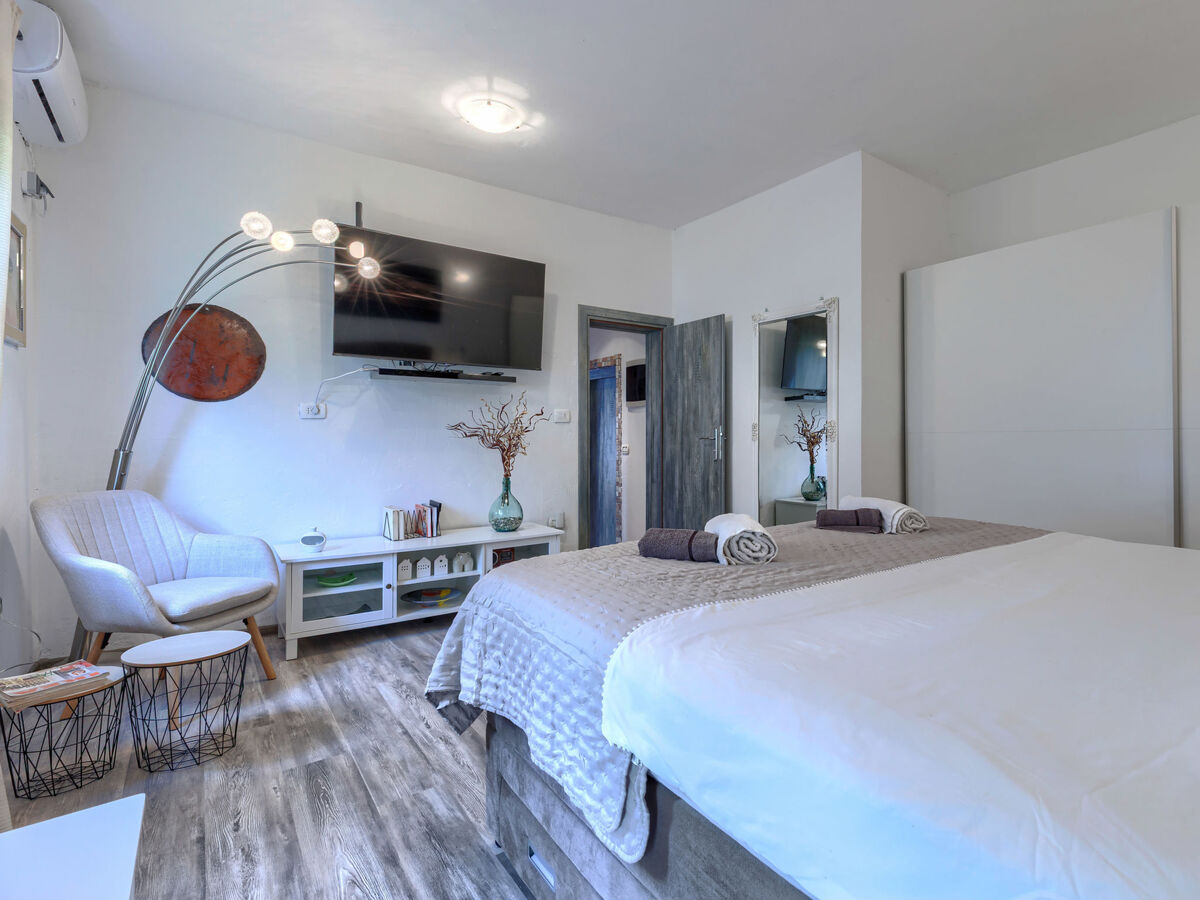 1 chambre avec 1 grand-lit (180 cm, longueur 200 cm), TV (satellite) et air-conditionné.
