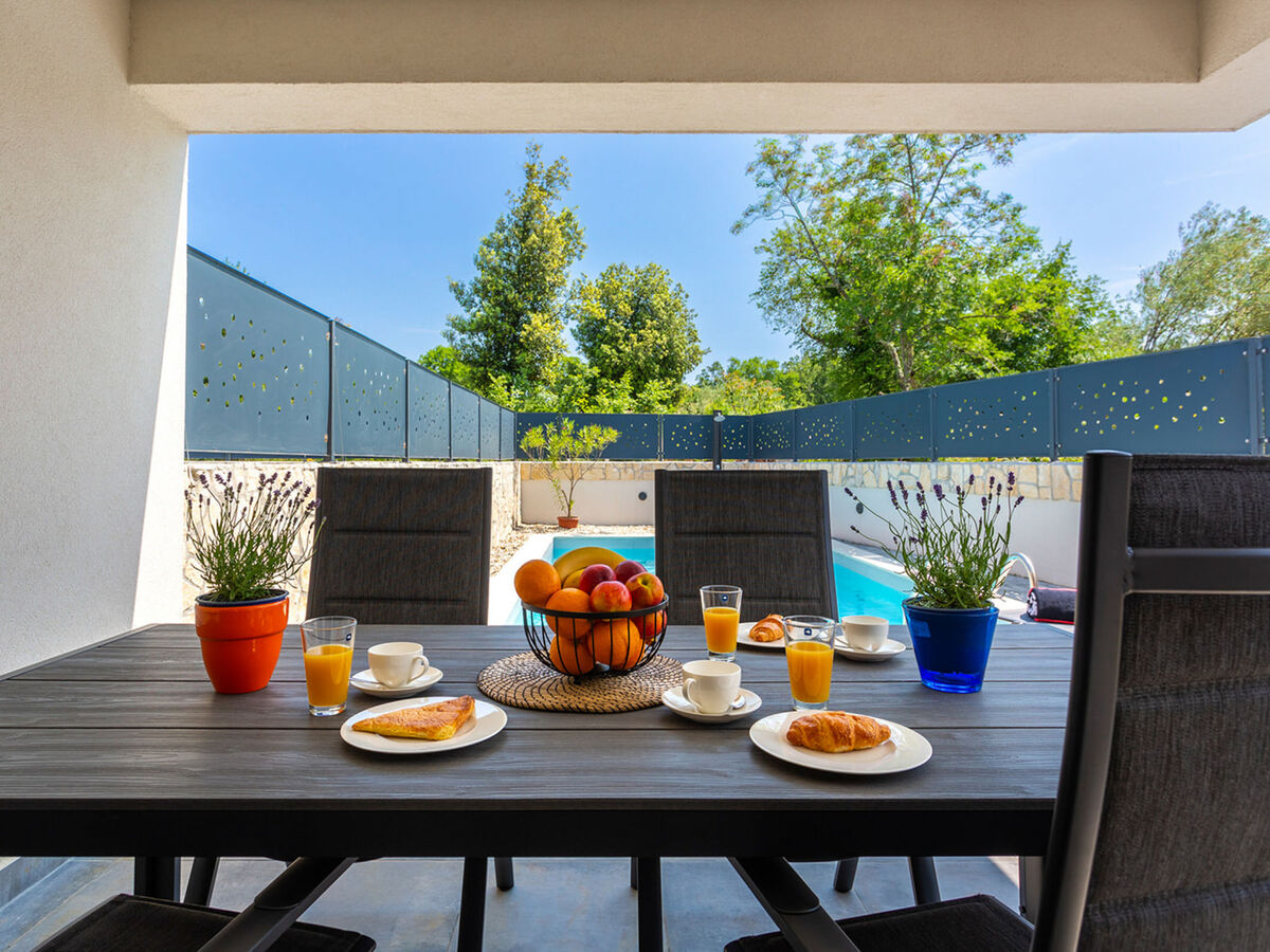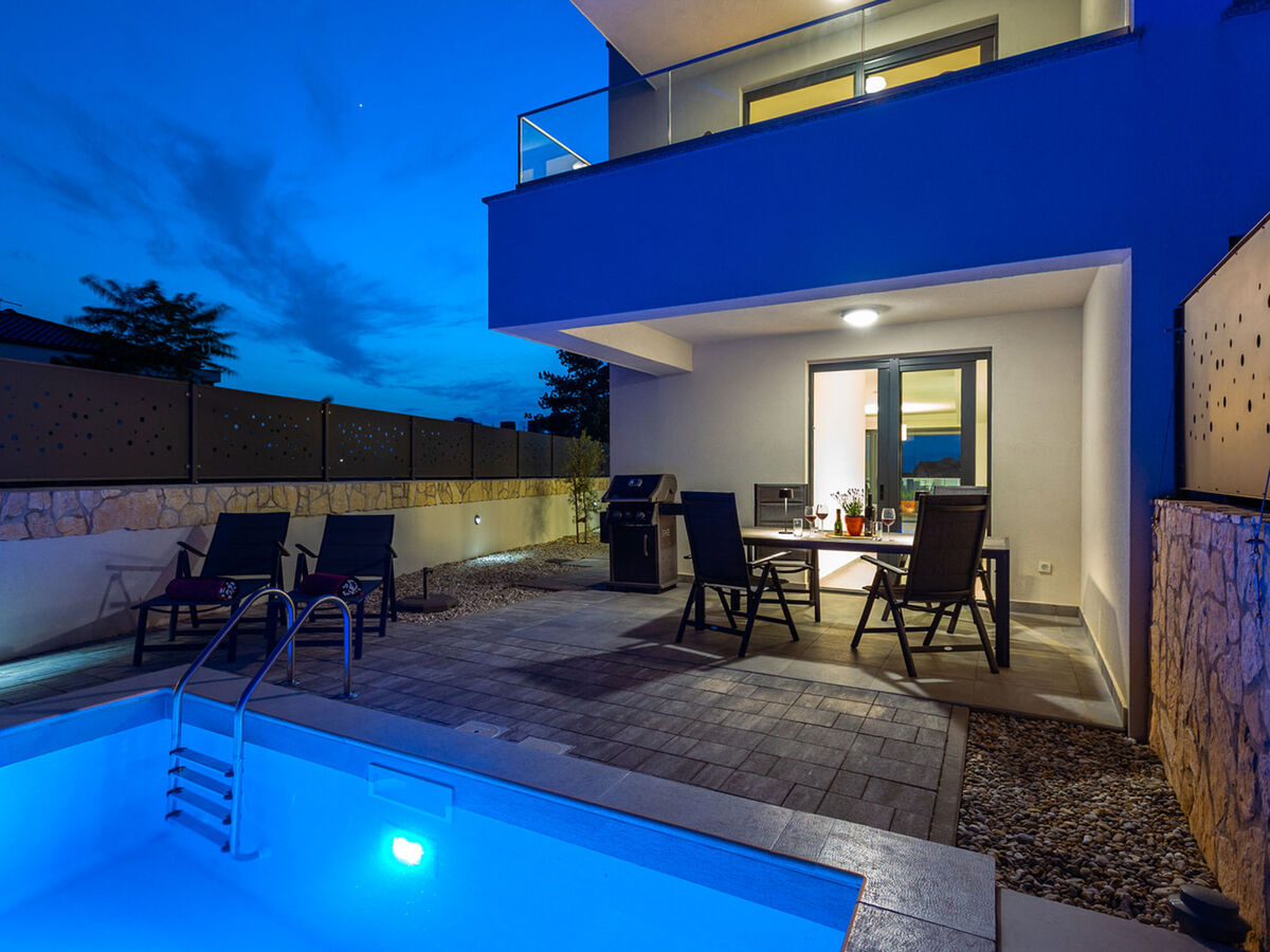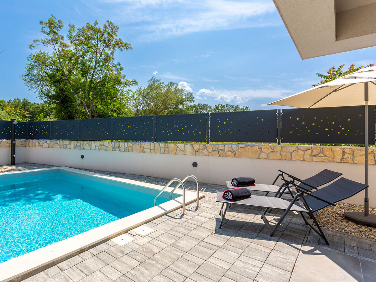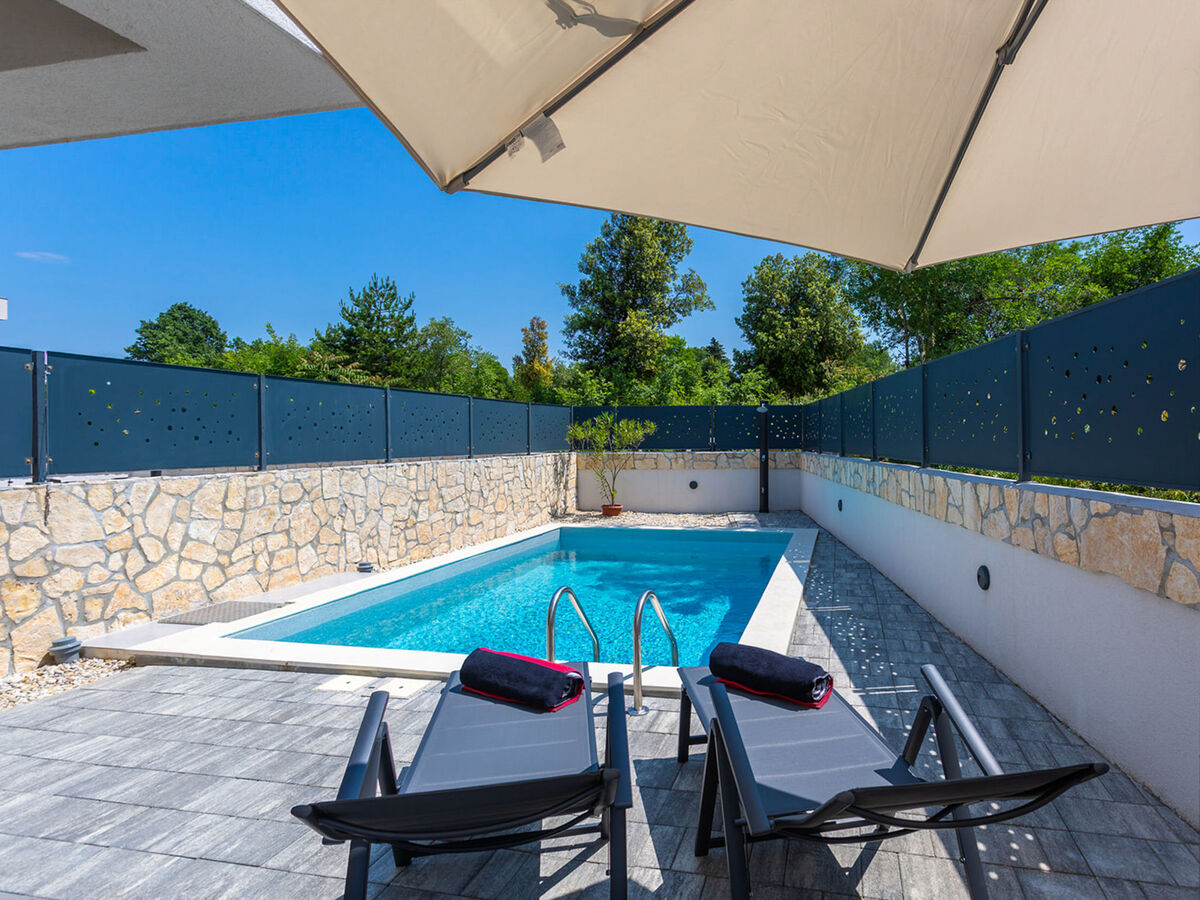 A usage privé: terrain 700 m2 (clôturé), piscine (6 x 4 m, 24 m2, profondeur 110 - 150 cm, disponibilité saisonnière: 01.Mai.