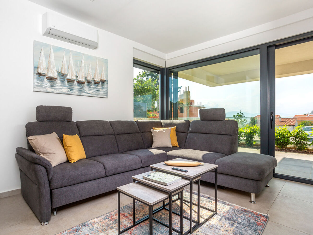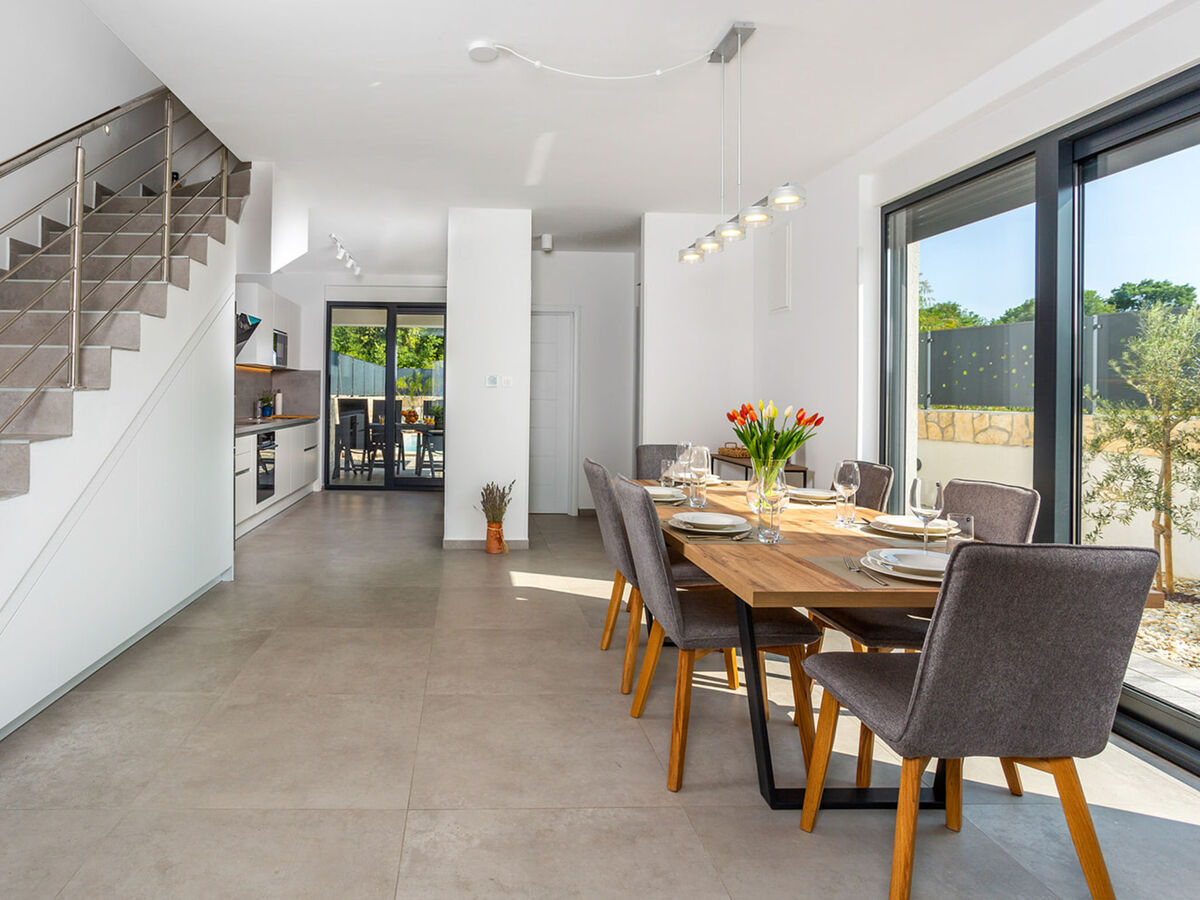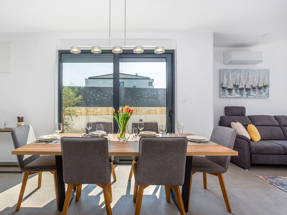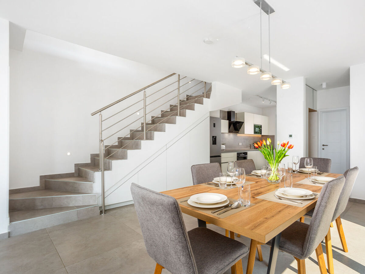 Aménagement agréable et moderne: séjour/salle à manger ouvert avec 1 divan-lit (160 cm, longueur 200 cm), table pour les repas.
