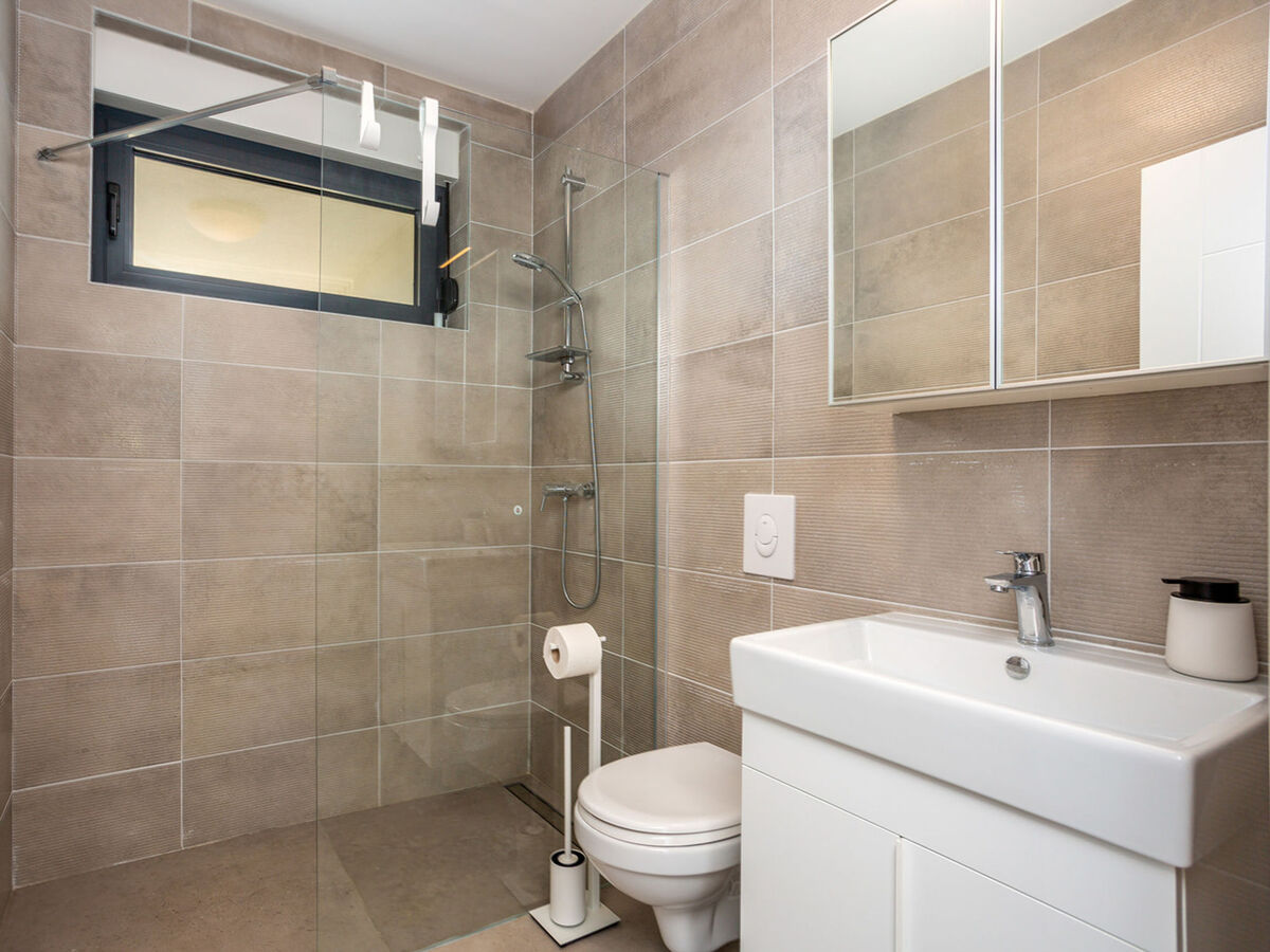 À l'étage supérieur: 1 chambre avec 1 grand-lit (160 cm, longueur 200 cm), douche/WC, Télévision numérique et air-conditionné.