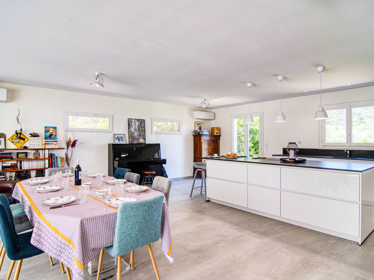 Aménagement confortable et agréable: grand séjour/salle à manger avec cheminée (uniquement à titre de décoration), table pour les repas et TV (écran plat), air-conditionné.