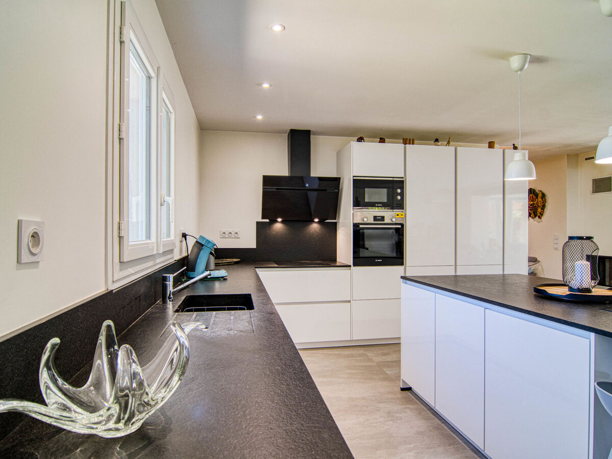 Coin cuisine (four, lave-vaisselle, 4 plaques vitrocéramiques, grille-pain, bouilloire électrique, micro-ondes, cafetière électrique, ilot de cuisine).