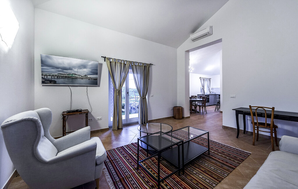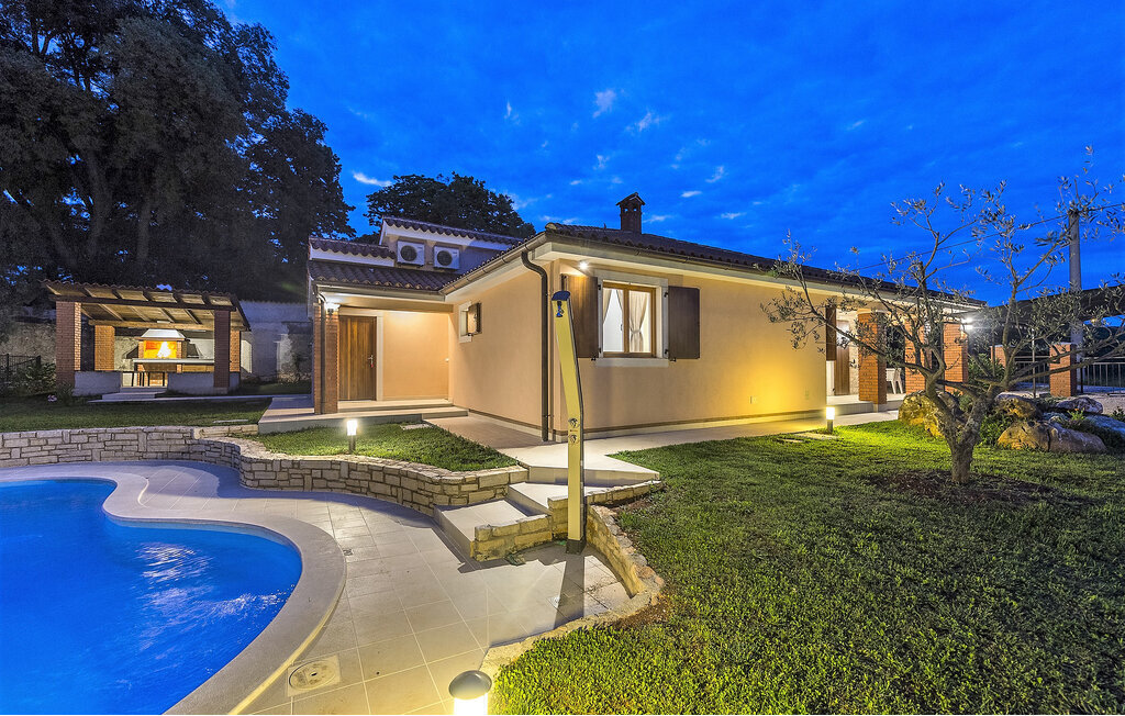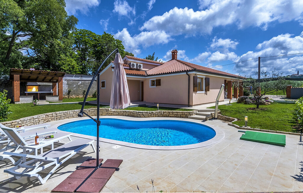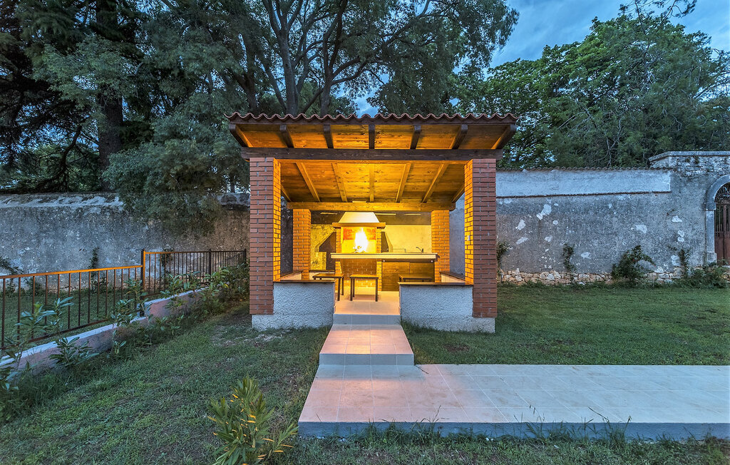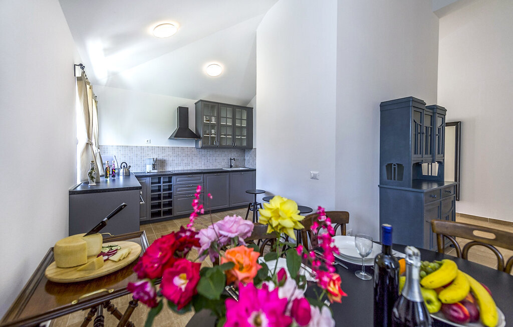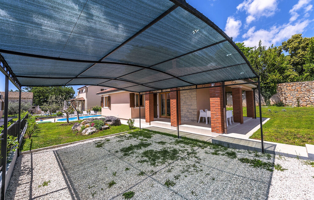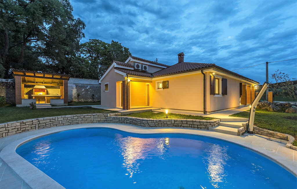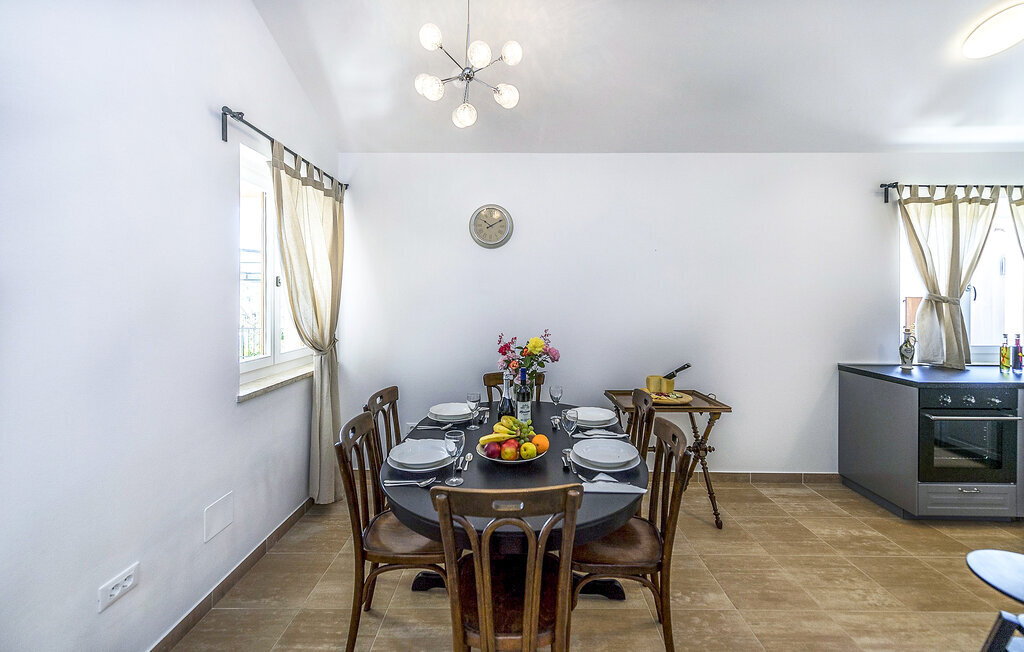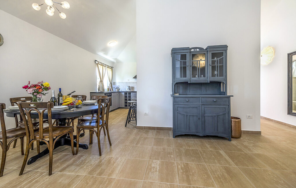 Dehors, une terrasse accueillante avec de nombreuses possibilités vous attend. La piscine, qui s'intègre joliment dans le jardin, devient rapidement le centre des heures passées à l'extérieur entourée de chaises longues, d'un parasol pour les moments calmes à l'ombre et d'un coin salon couvert. Profitez de l'espace barbecue couvert pour préparer des plats croates traditionnels et savourer votre repas en plein air. Ici, le jardin se transforme en scène pour des journées de vacances relaxantes.
