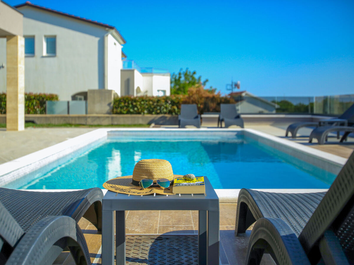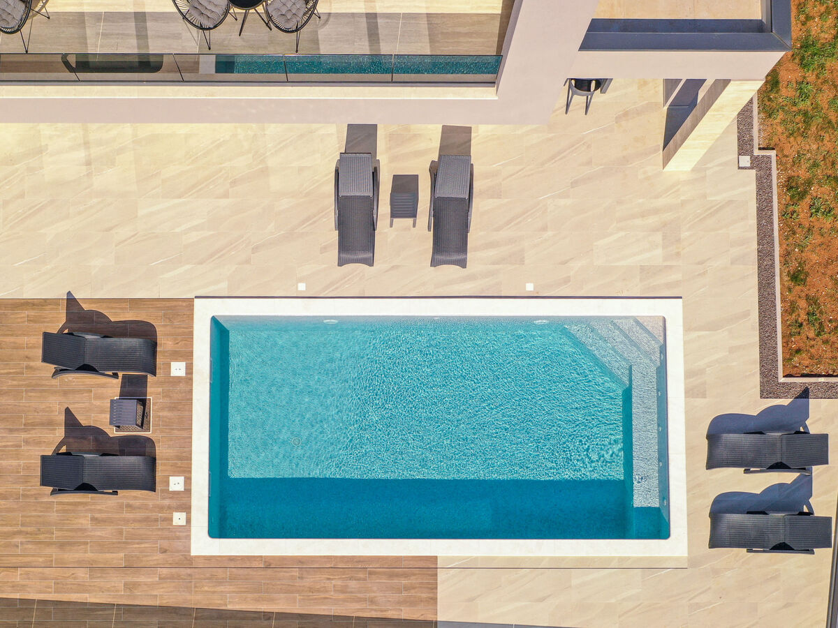 A usage privé: terrain 720 m2 (clôturé), jardin, piscine rectangulaire (8 x 4 m, profondeur 140 cm, disponibilité saisonnière: 01.Avr.