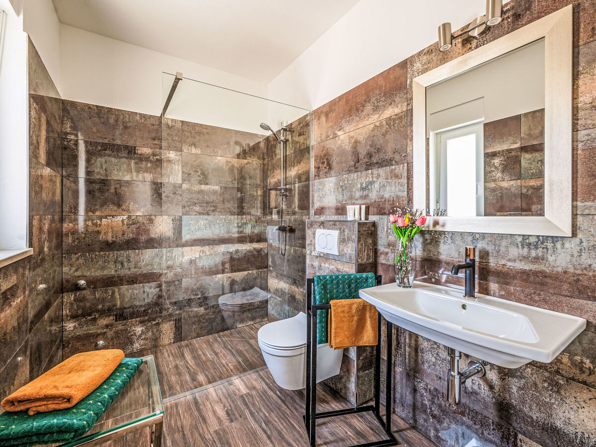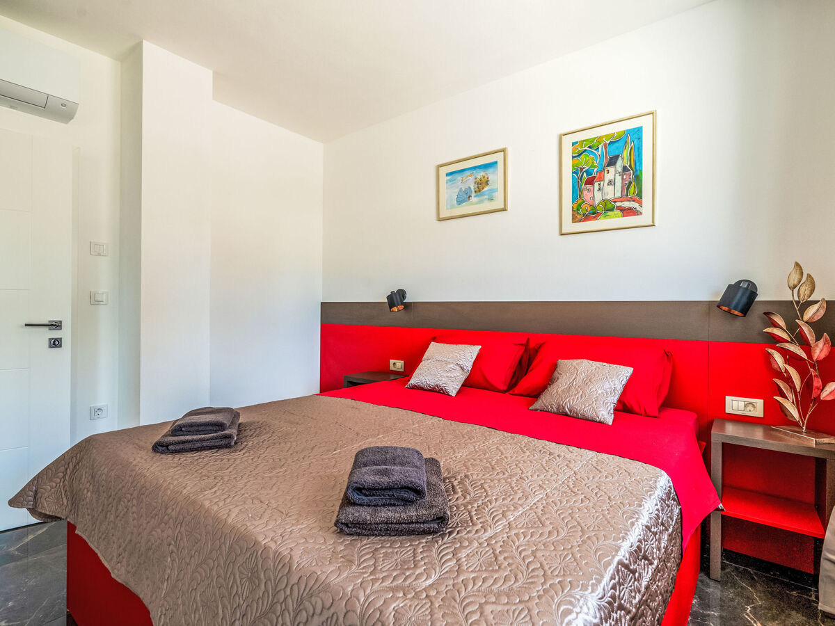 À l'étage supérieur: 1 chambre avec 1 divan-lit (90 cm, longueur 190 cm), 1 grand-lit (160 cm, longueur 200 cm), douche/bidet/WC et TV (satellite) (écran plat), air-conditionné.