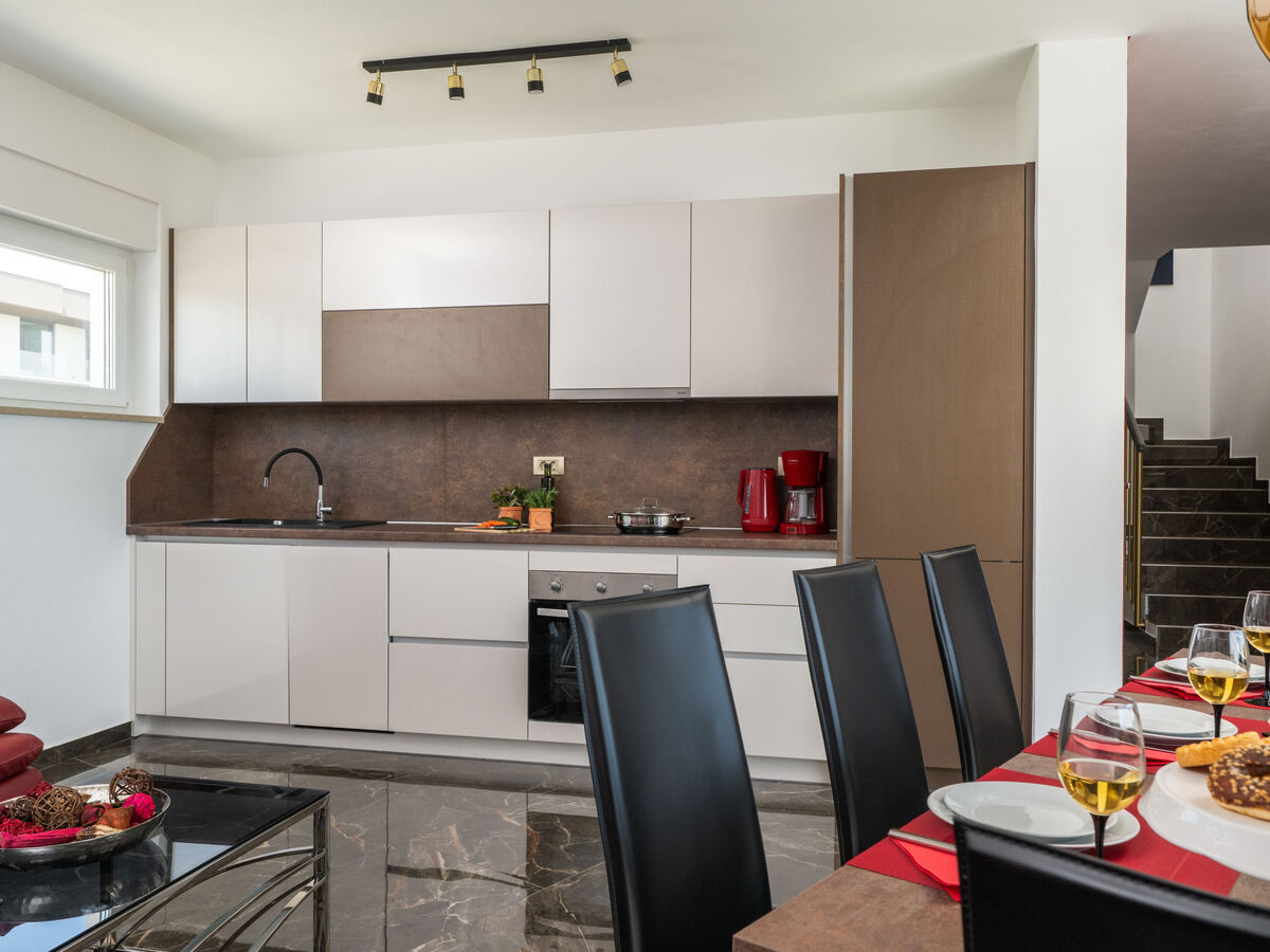 Cuisine ouverte (four, lave-vaisselle, 4 plaques vitrocéramiques, bouilloire électrique, congélateur, cafetière électrique).