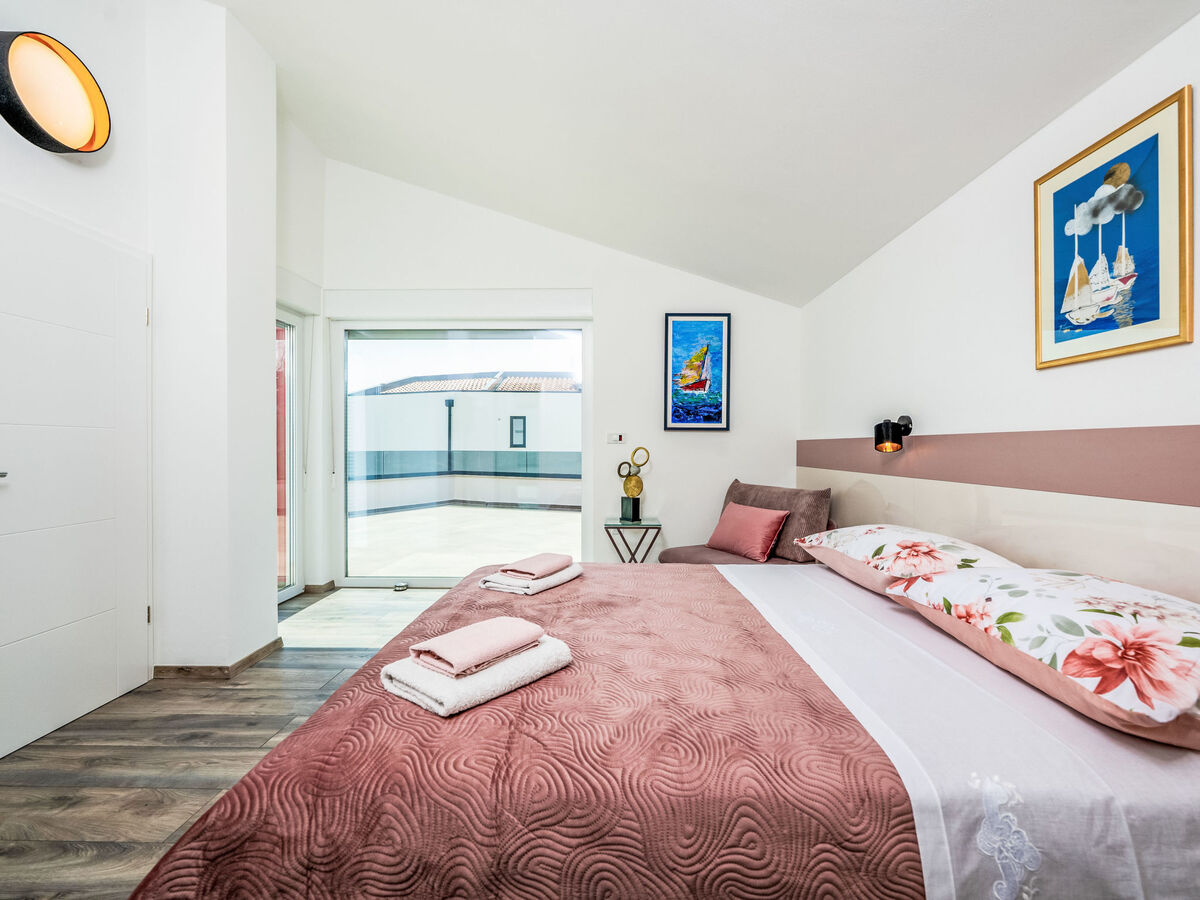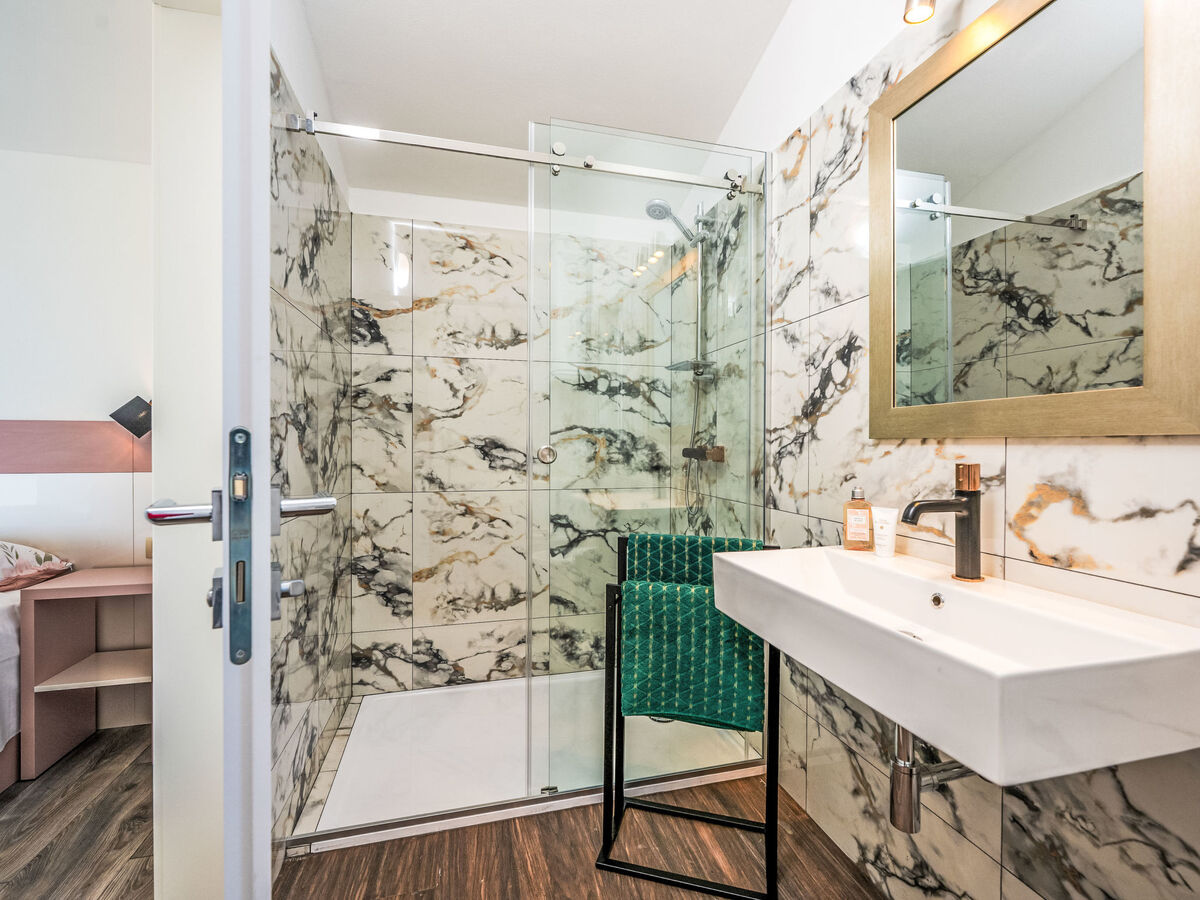 1 chambre avec baie vitrée avec 1 grand-lit (160 cm, longueur 200 cm), douche/WC et TV (satellite) (écran plat), air-conditionné.