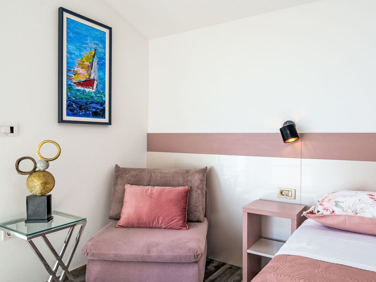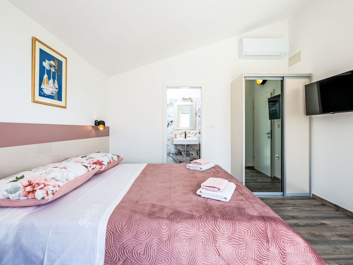 1 chambre avec 1 lit double (2 x 90 cm, longueur 200 cm), douche/WC et TV (satellite) (écran plat), air-conditionné.
