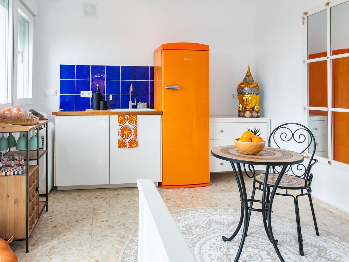 Cuisine ouverte (four, lave-vaisselle, 3 plaques vitrocéramiques, grille-pain, bouilloire électrique, congélateur, cafetière électrique) avec table pour les repas.