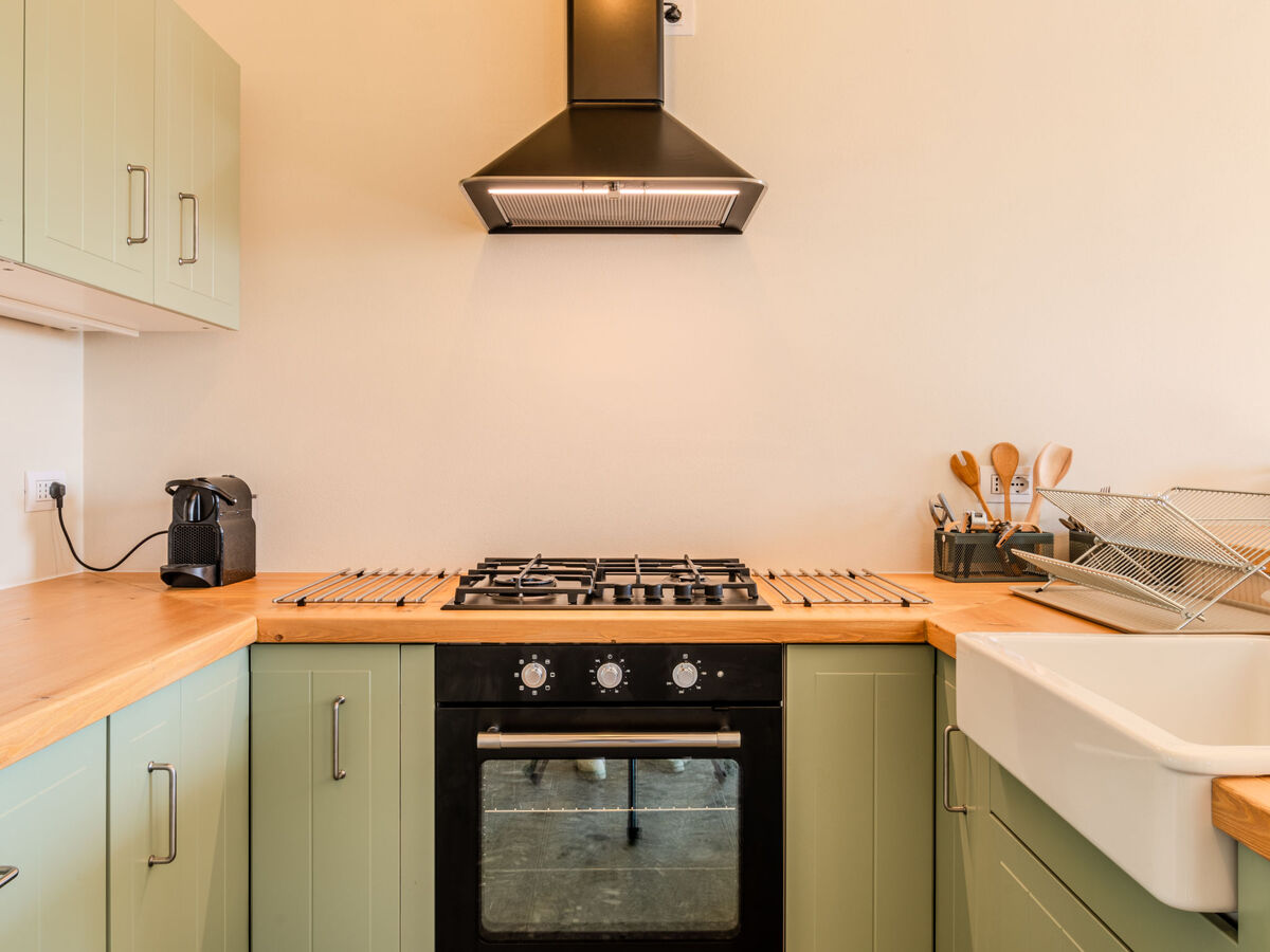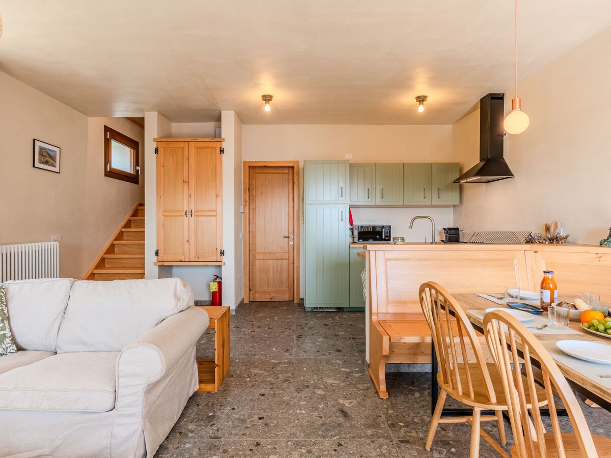Cuisine ouverte (four, lave-vaisselle, bouilloire électrique, micro-ondes, cafetière électrique, Capsules pour machine à café (Nespresso)) avec table pour les repas.