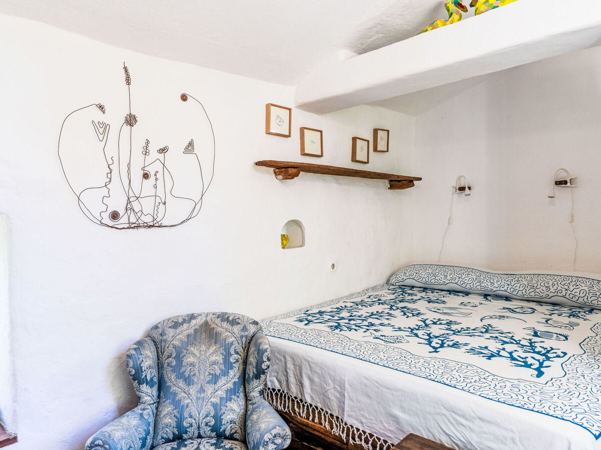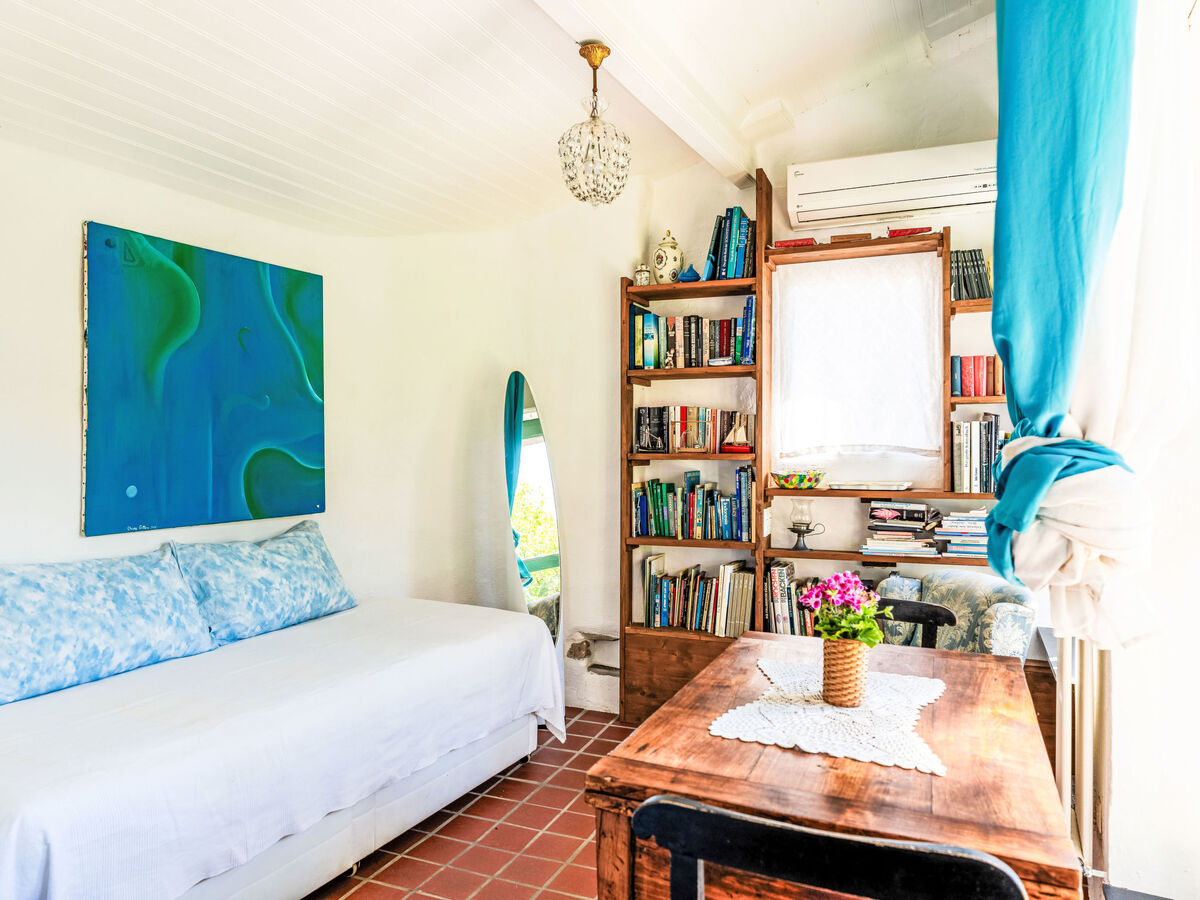 À l'étage supérieur: séjour/chambre à coucher avec 2 divans-lits doubles (2 x 140 cm, longueur 200 cm), douche/WC.