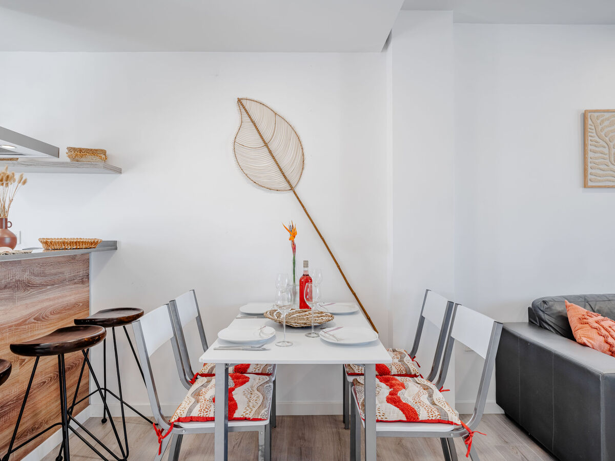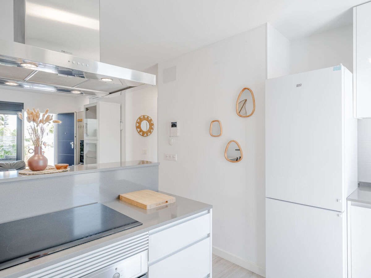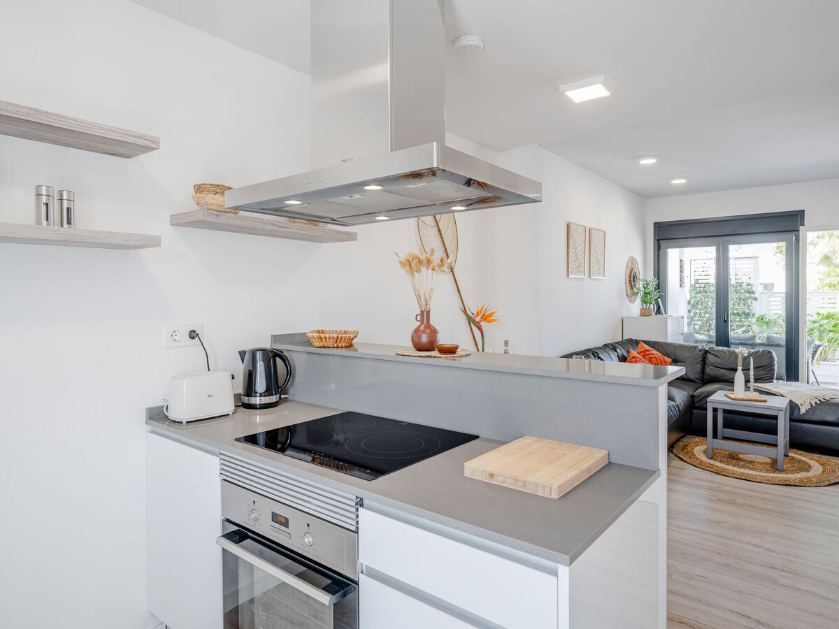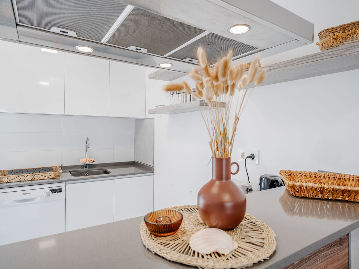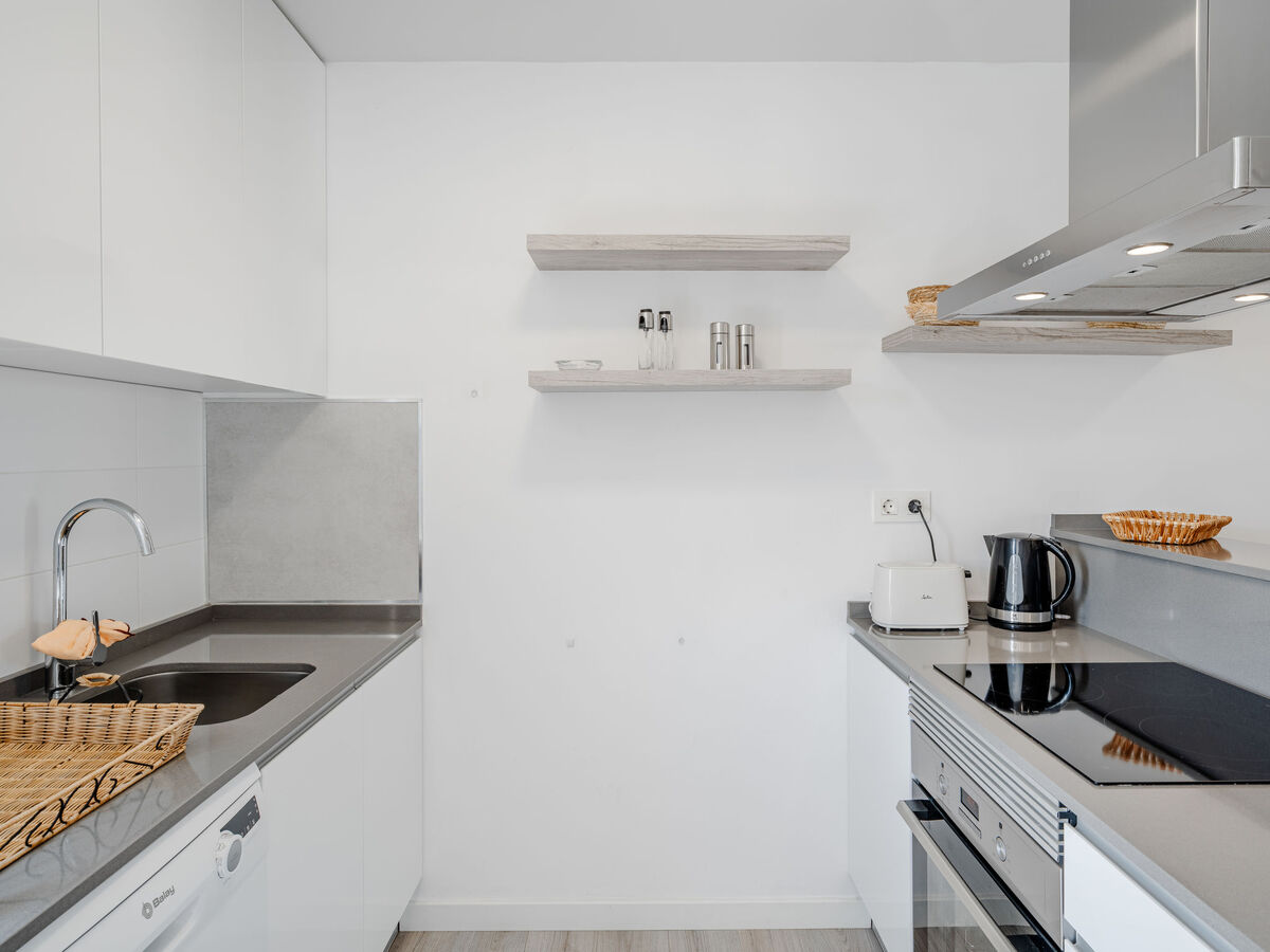 Cuisine ouverte (four, lave-vaisselle, 3 plaques à induction, grille-pain, bouilloire électrique, micro-ondes, congélateur, cafetière électrique, Capsules pour machine à café (Dolce Gusto) (NON INCLUSES)) avec air-conditionné et chauffage à air chaud.
