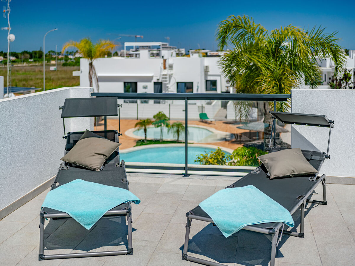 Meubles de terrasse, chaises longues, loggia, place pour s'asseoir.