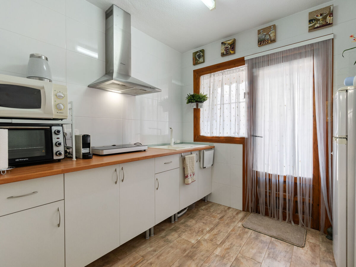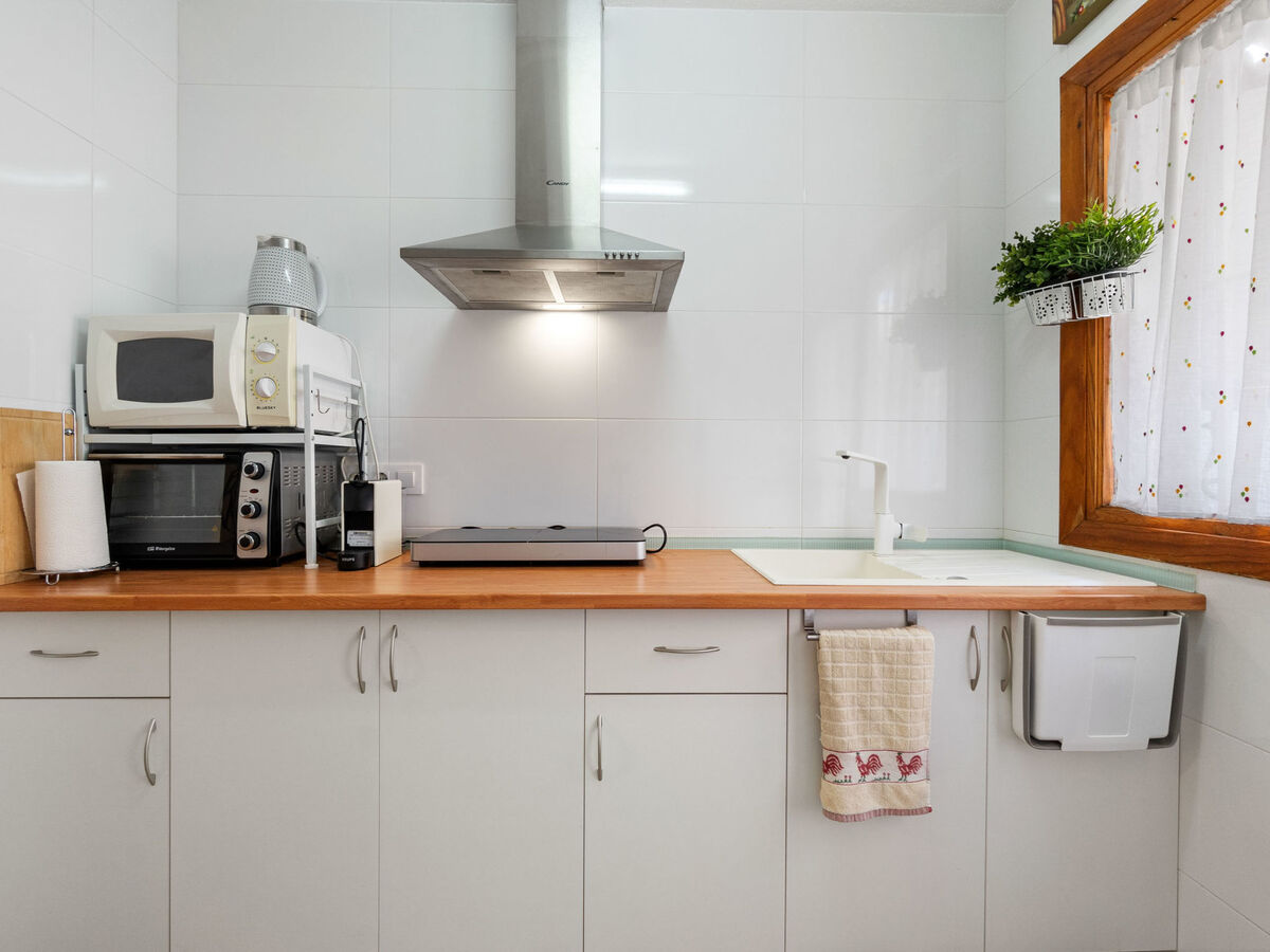 Cuisine ouverte (four, 2 plaques vitrocéramiques, grille-pain, micro-ondes, congélateur, cafetière électrique).