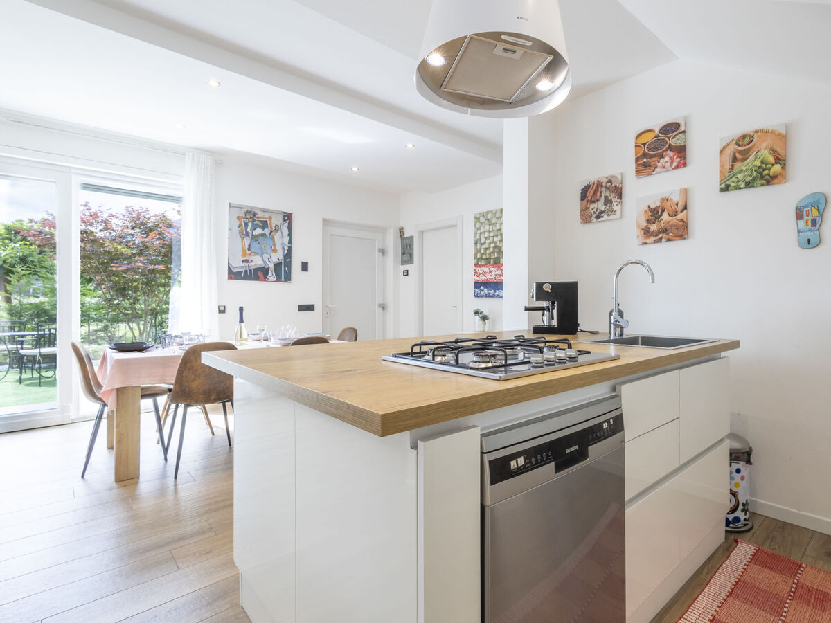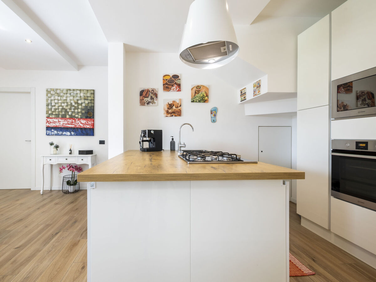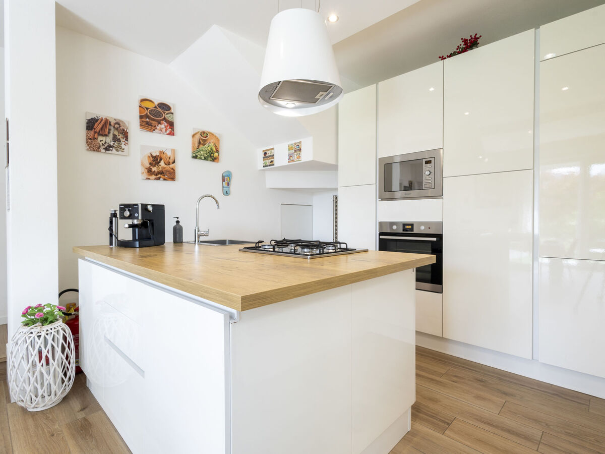Cuisine ouverte (four, lave-vaisselle, 4 feux, grille-pain, bouilloire électrique, micro-ondes, congélateur, cafetière électrique, Capsules pour machine à café (Nespresso) inclus, ilot de cuisine).