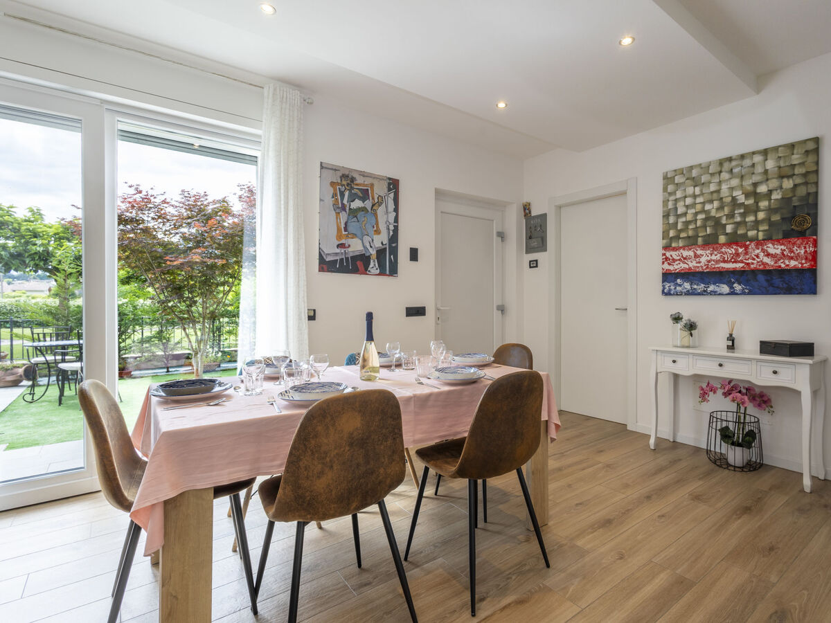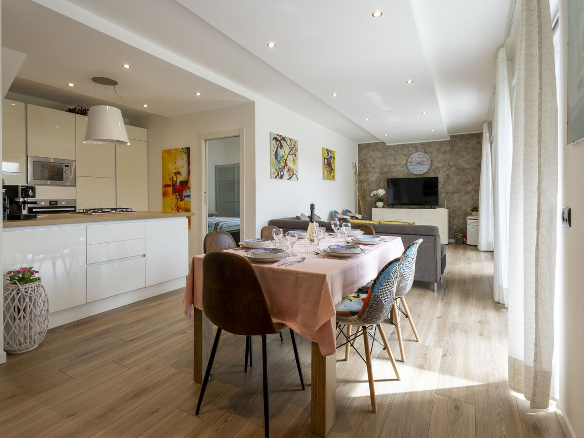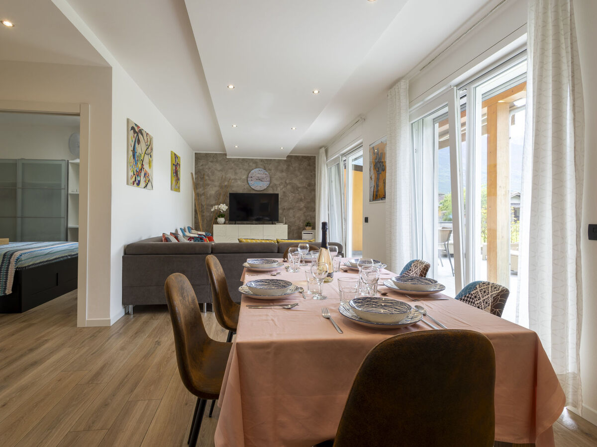Clair, aménagement confortable et moderne: grand séjour/salle à manger avec baie vitrée avec table pour les repas et TV.