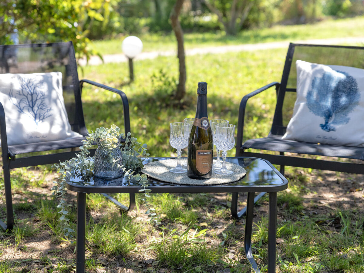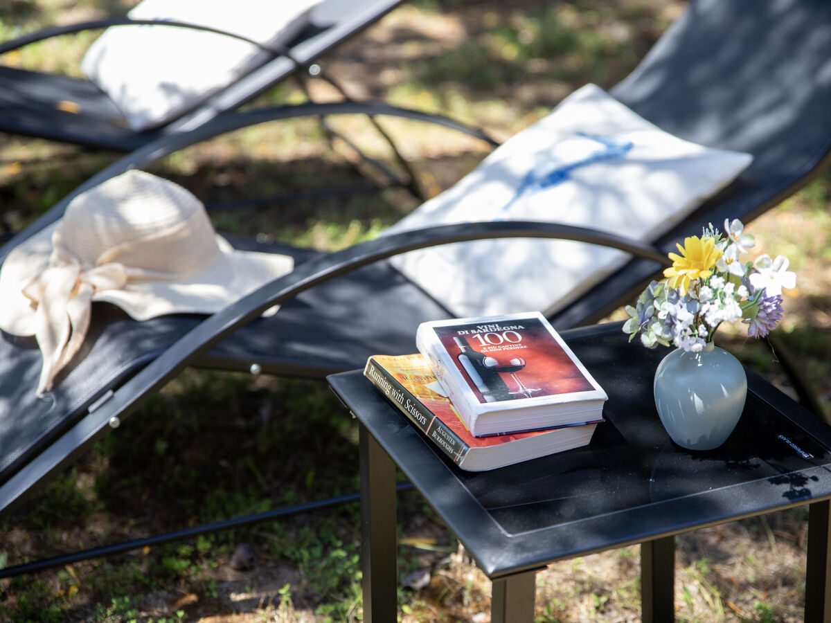 Meubles de terrasse, barbecue, chaises longues, place pour s'asseoir.