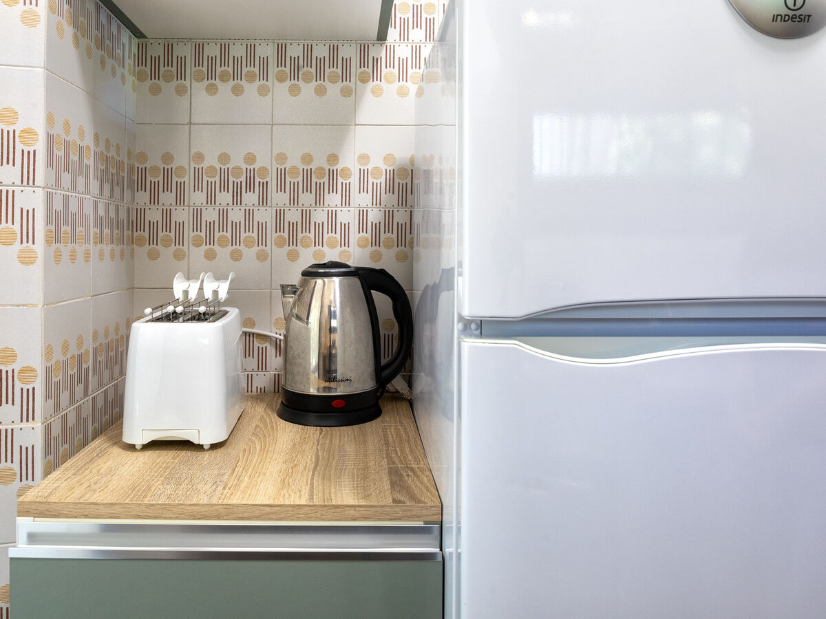 Petite cuisine (4 plaques de cuisson, four, grille-pain, bouilloire électrique).