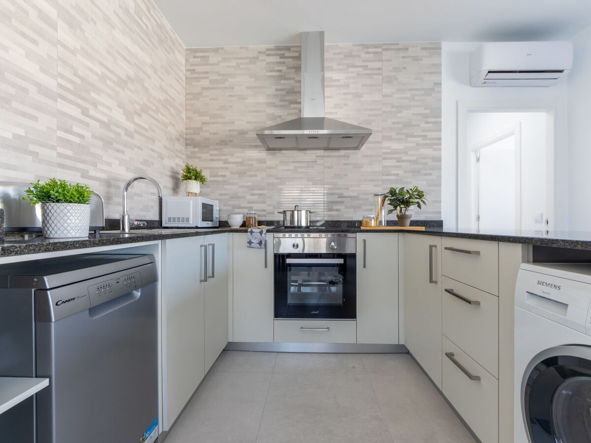 Cuisine ouverte (four, lave-vaisselle, 3 plaques vitrocéramiques, grille-pain, micro-ondes, congélateur, cafetière électrique) avec bar.