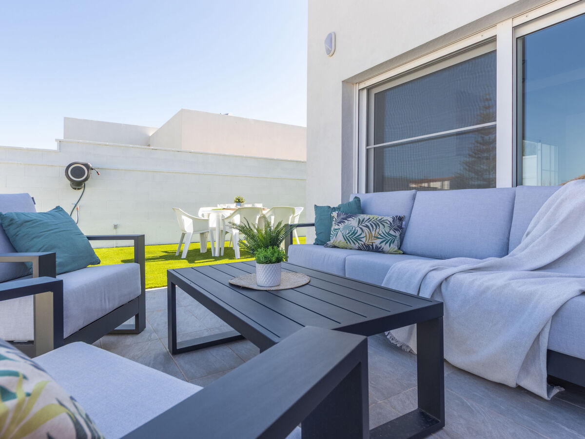 Meubles de terrasse, barbecue, chaises longues, loggia.