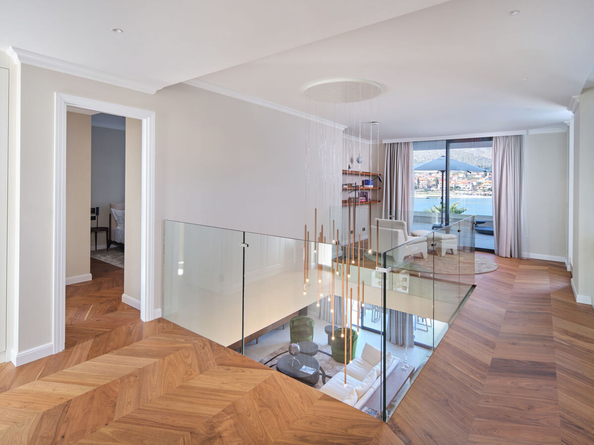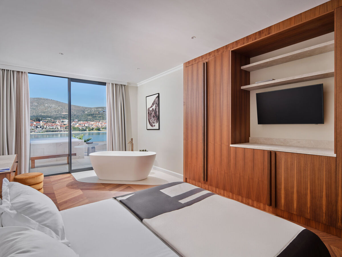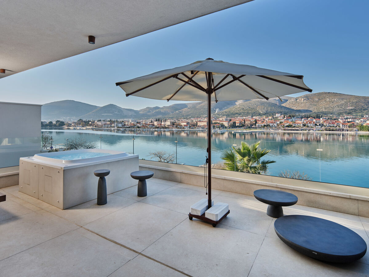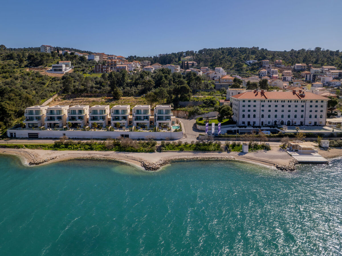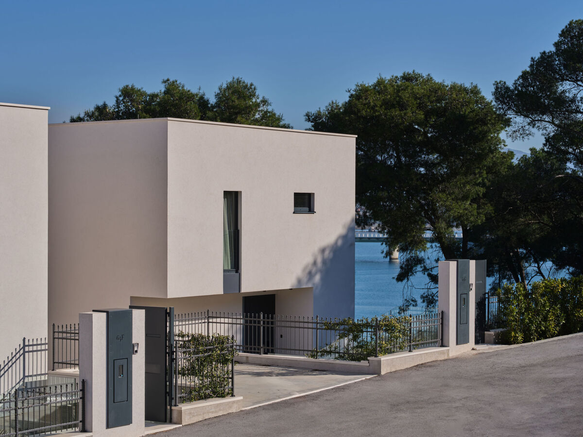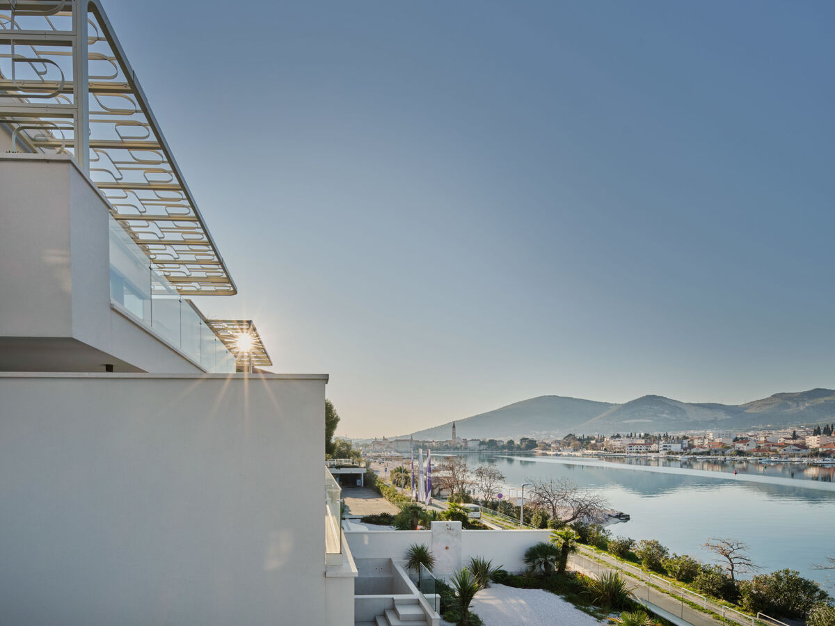 À 700 m du centre de Trogir, à 10 m de la mer, à 10 m de la plage, route à traverser, orientée nord.