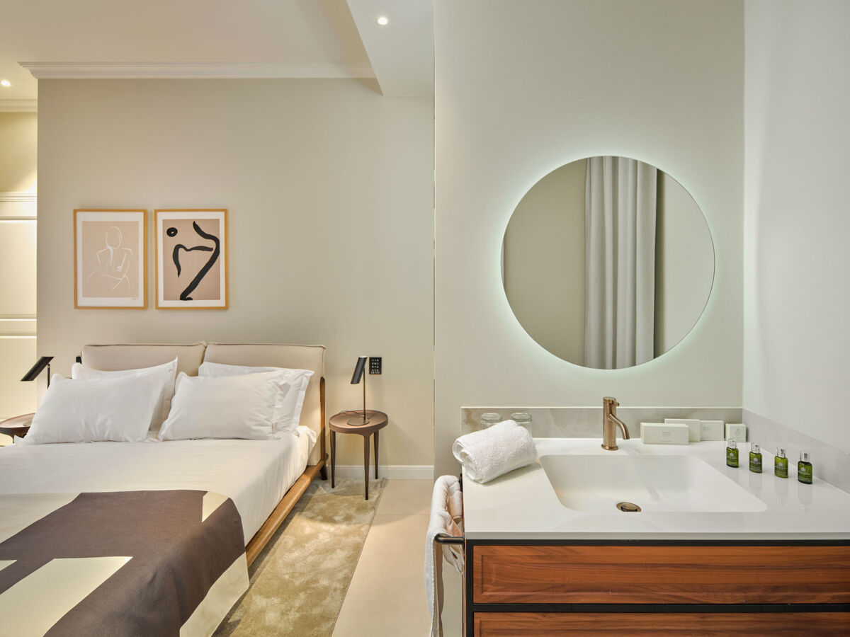 1 chambre avec 1 grand-lit (180 cm, longueur 200 cm), bain/douche/WC et TV (satellite) (écran plat).