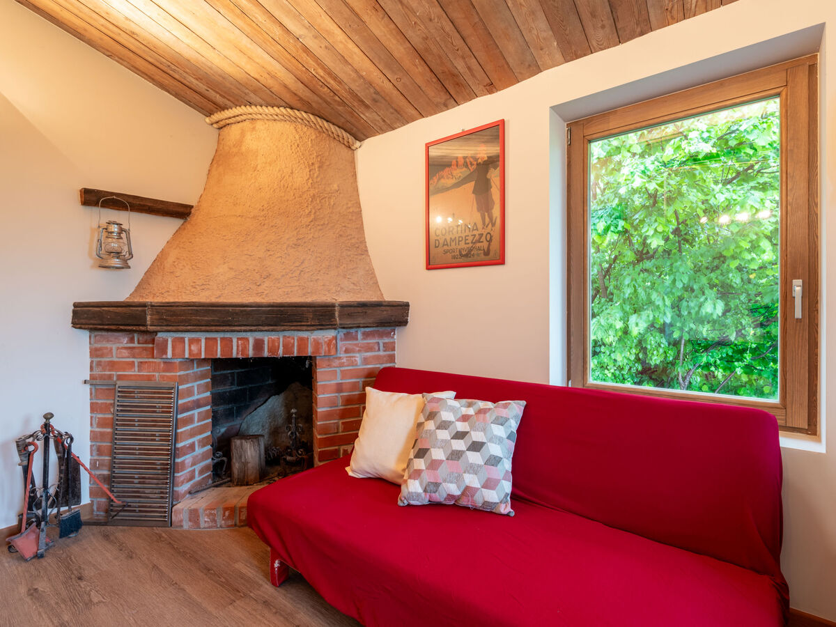 Aménagement confortable et avec beaucoup de bois: séjour/chambre à coucher avec 1 divan-lit, cheminée et TV.