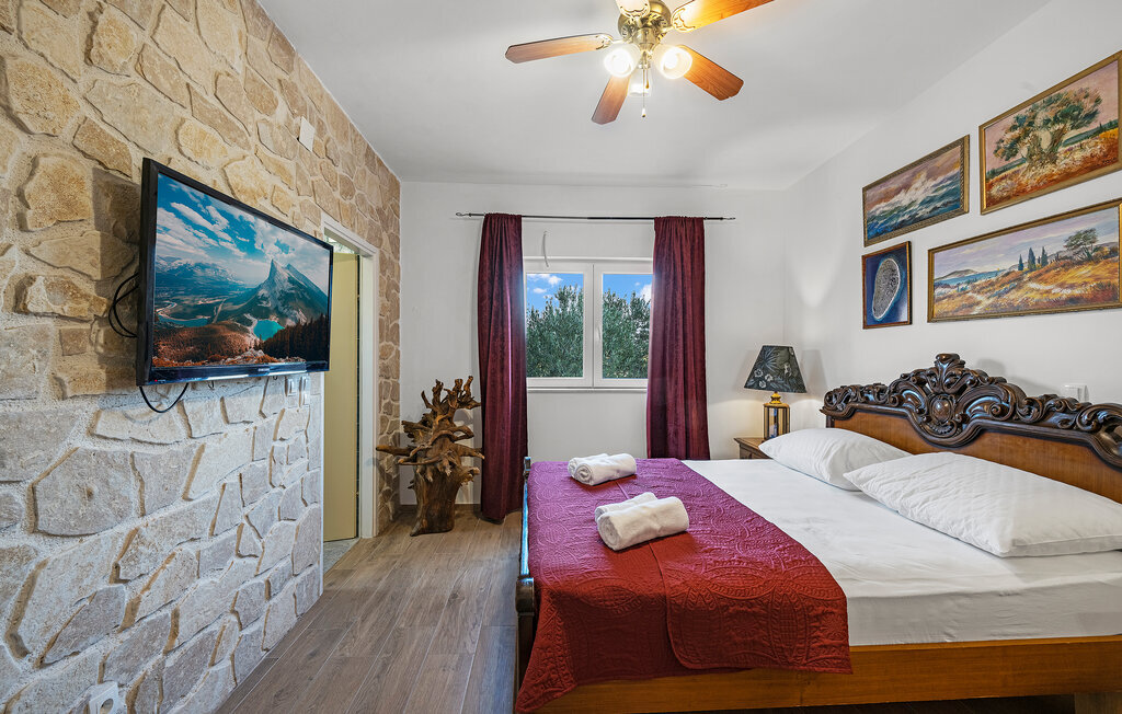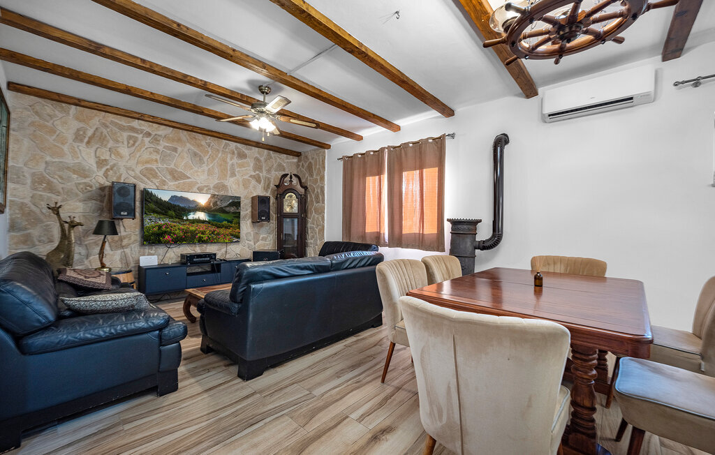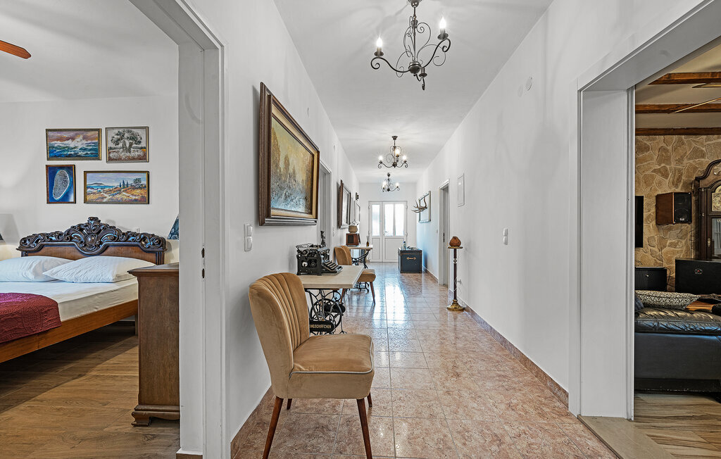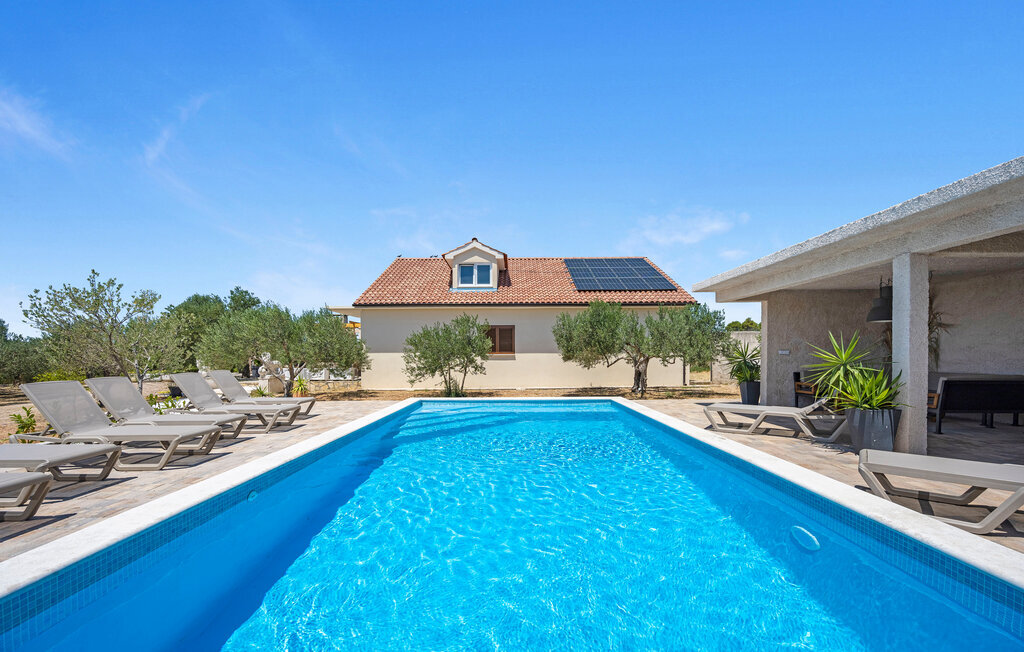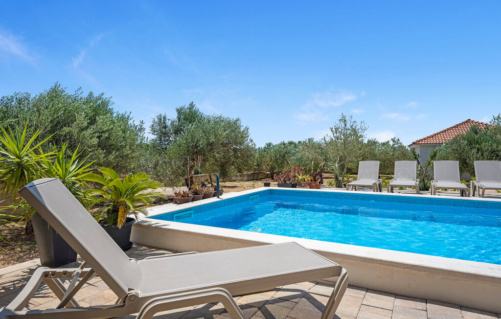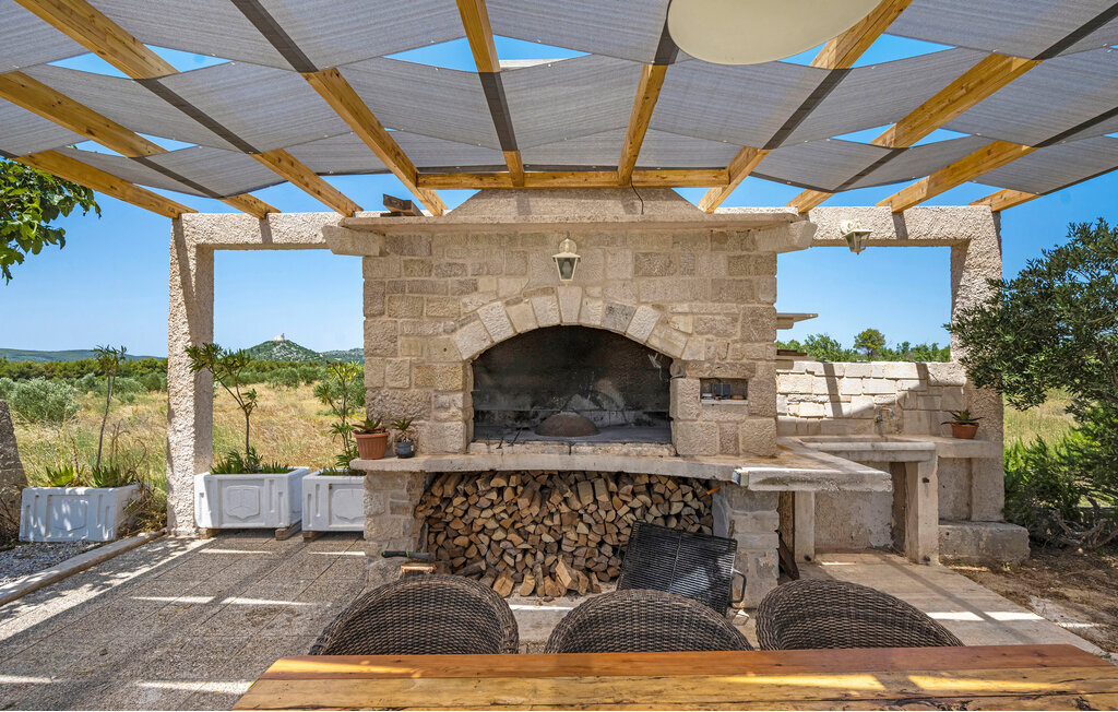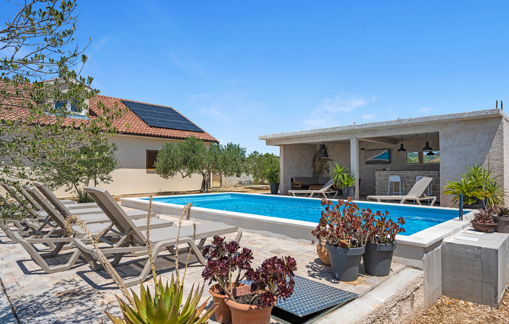 L'espace extérieur sensationnel est un véritable havre de paix. Le matin, faites tranquillement des longueurs dans la magnifique piscine, prenez le soleil sur la chaise longue et offrez-vous une boisson rafraîchissante à l'ombre. Écoutez le doux crépitement de la cheminée extérieure ou savourez les délices du barbecue avec vue sur l'oliveraie.