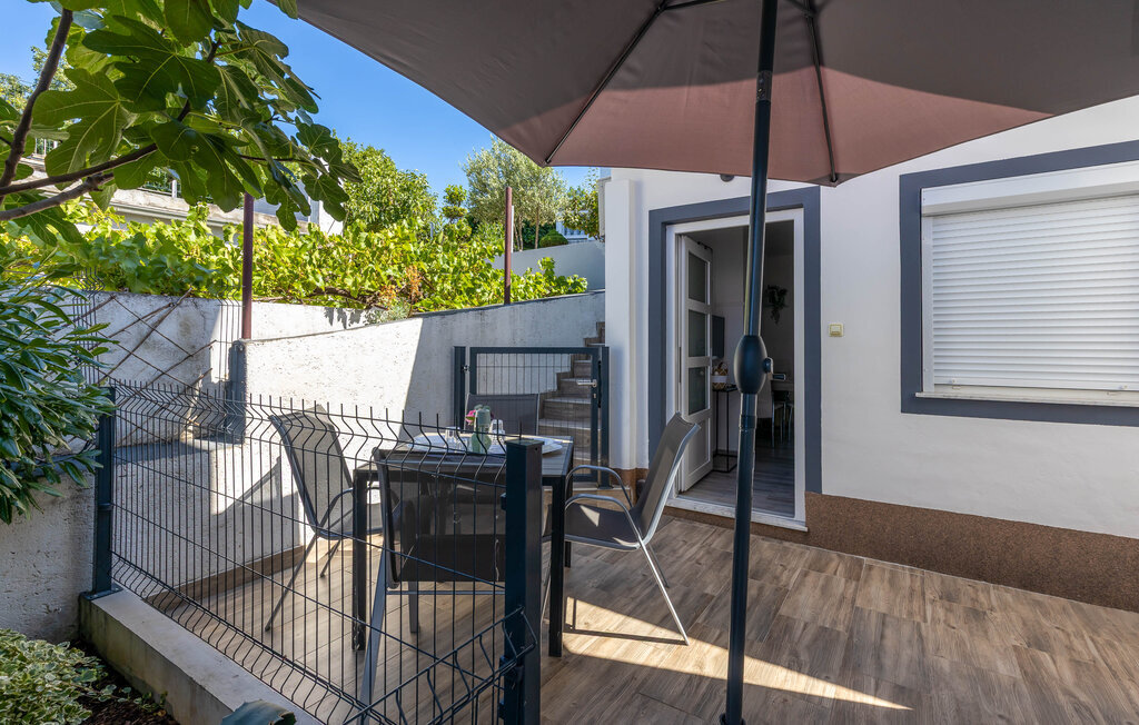 Sur la terrasse ouverte, vous pouvez commencer la journée en prenant un copieux petit-déjeuner à l'ombre. Le soir, vous pourrez y apprécier l'atmosphère paisible autour d'un verre de vin.