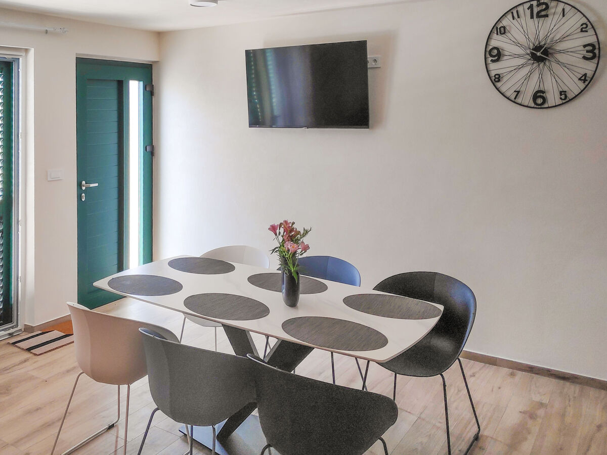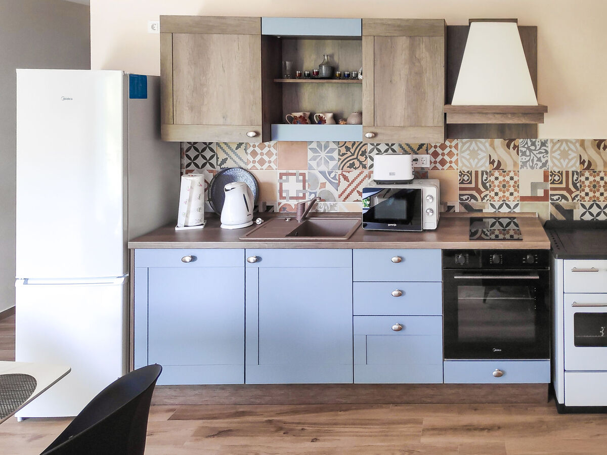 Cuisine (lave-vaisselle, 4 plaques à induction, grille-pain, bouilloire électrique, micro-ondes, congélateur, cafetière électrique) avec table pour les repas.