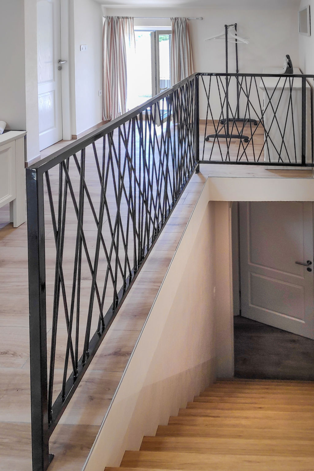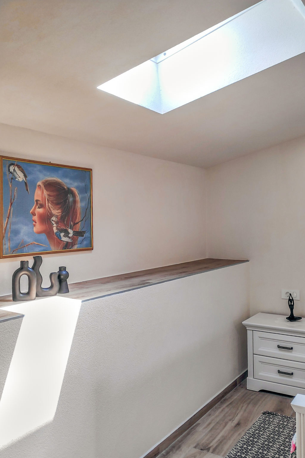 À l'étage supérieur: 1 chambre, mansardée hauteur plafond 160 - 240 cm, sans armoire avec 1 lit double (2 x 90 cm, longueur 200 cm), air-conditionné.