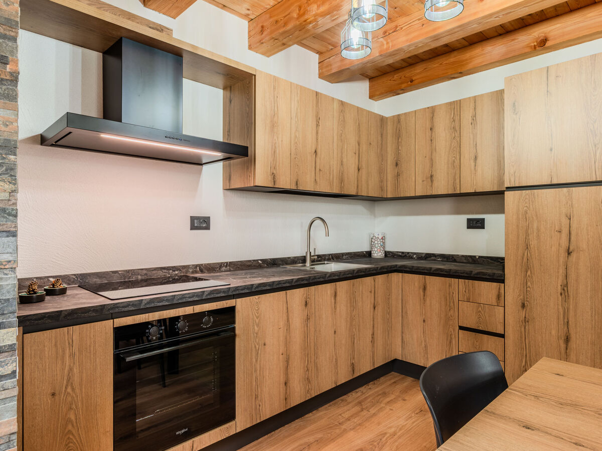 Cuisine ouverte (four, lave-vaisselle, 5 plaques à induction, bouilloire électrique, micro-ondes, congélateur, cafetière électrique) avec table pour les repas.