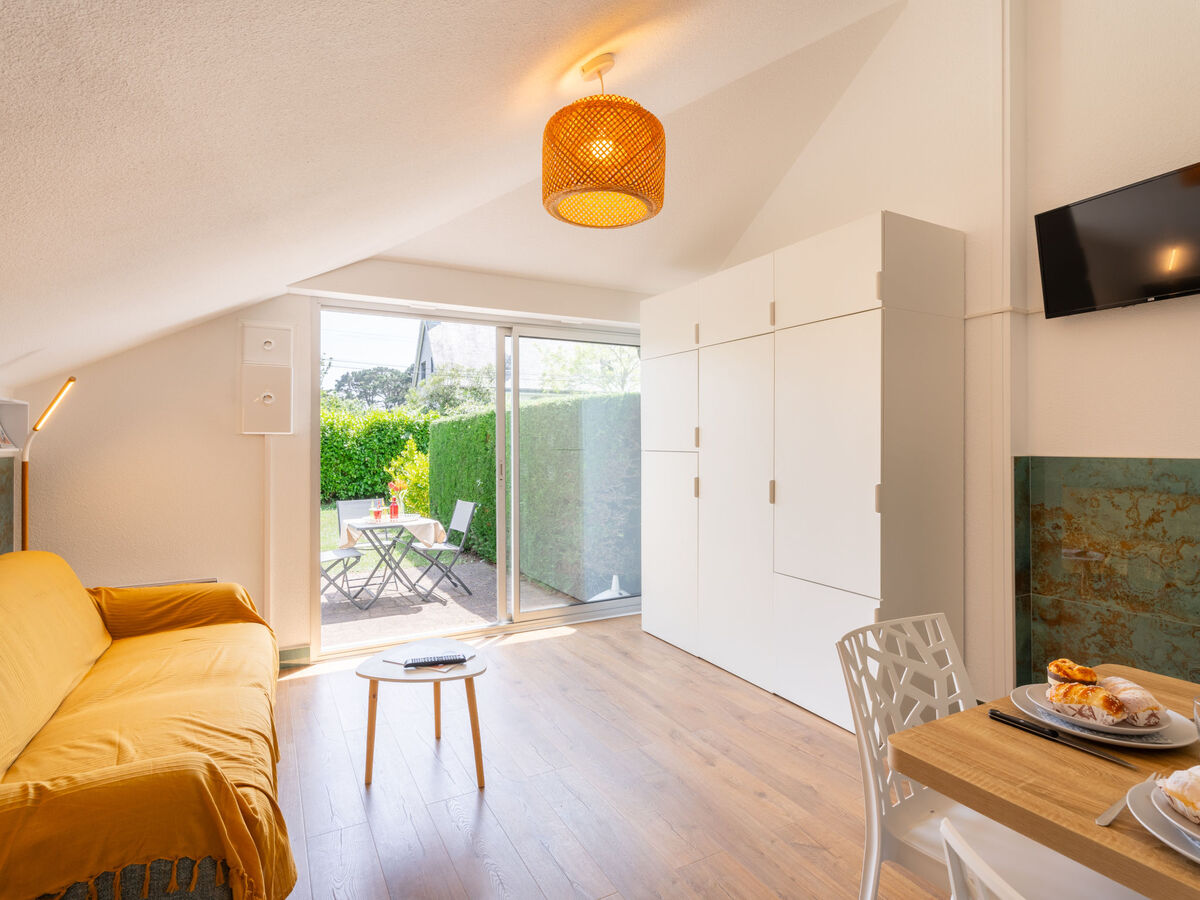 Séjour/salle à manger avec 1 divan-lit double (1 x 140 cm, longueur 190 cm), TV (écran plat).
