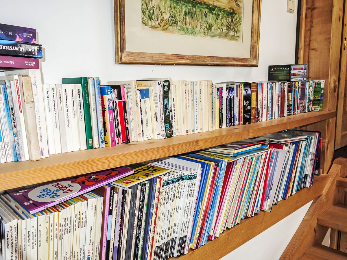 À l'étage supérieur: salon avec bibliotheque, TV (satellite) et écran plat.