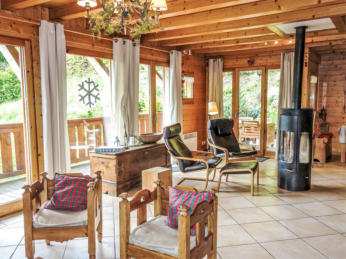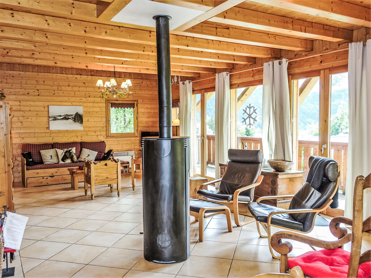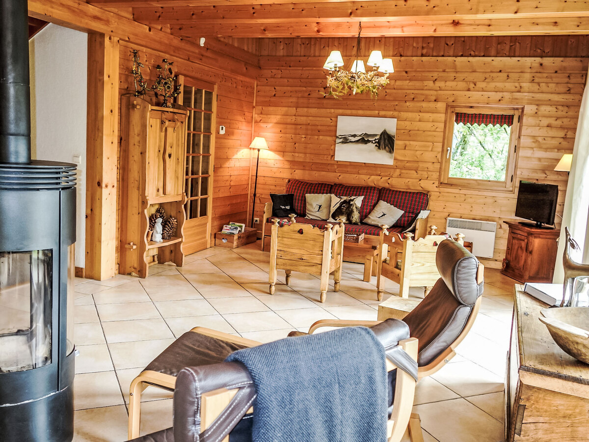 Aménagement confortable et agréable: séjour/salle à manger avec TV, radio, lecteur CD et poêle à bois.