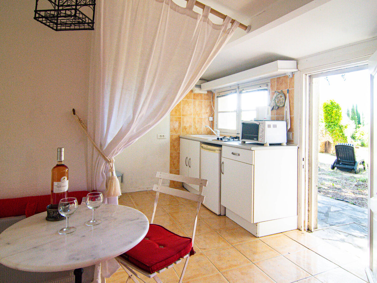Coin cuisine (2 plaques de cuisson, bouilloire électrique, micro-ondes, cafetière électrique) avec petite table pour les repas.