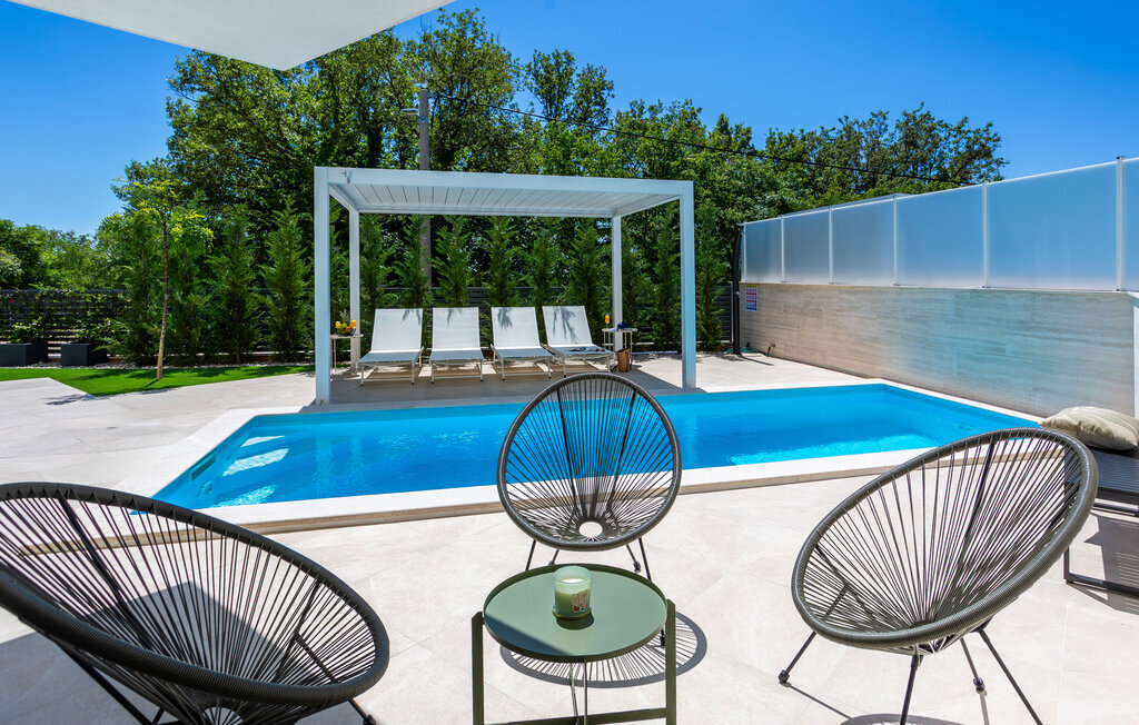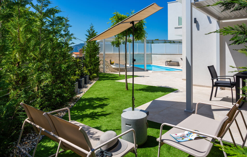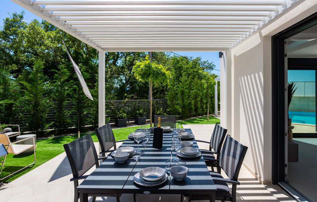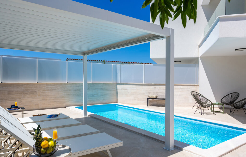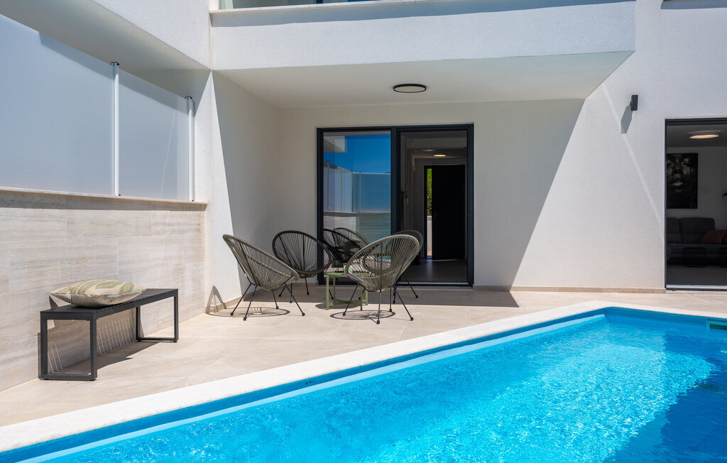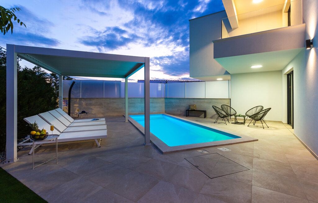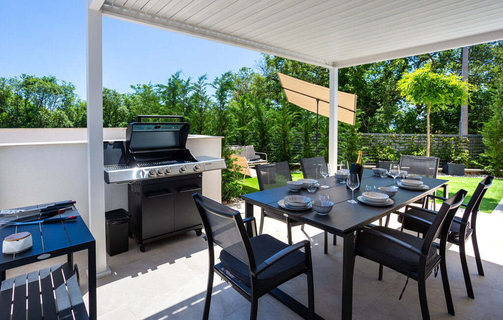 Le matin, montez pieds nus sur votre terrasse ensoleillée et faites tranquillement des longueurs dans la magnifique piscine. De longues heures sous le ciel bleu, des heures de lecture à l'ombre et des repas conviviaux sur la terrasse accueillante vous attendent. Allumez le barbecue et discutez autour d'un verre de vin et à la lueur des bougies jusque tard dans la chaude nuit d'été.