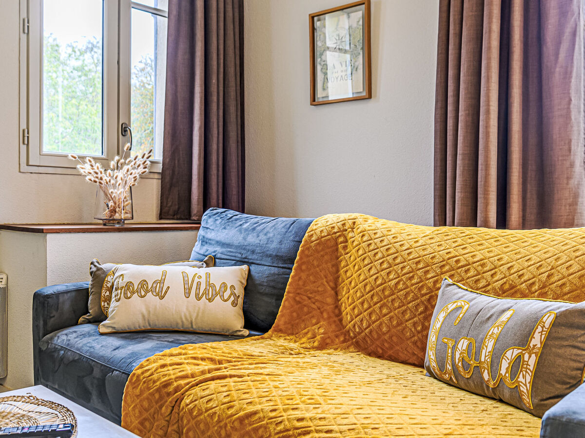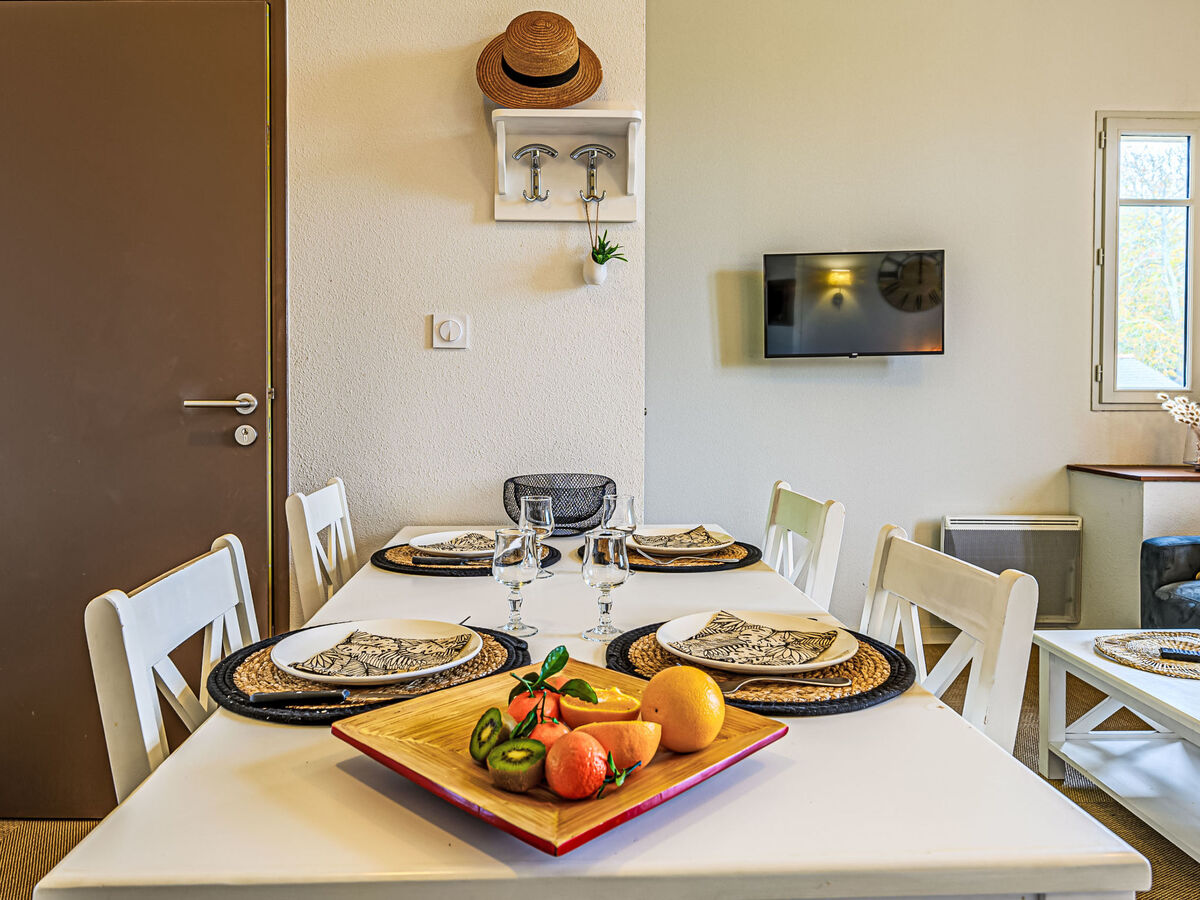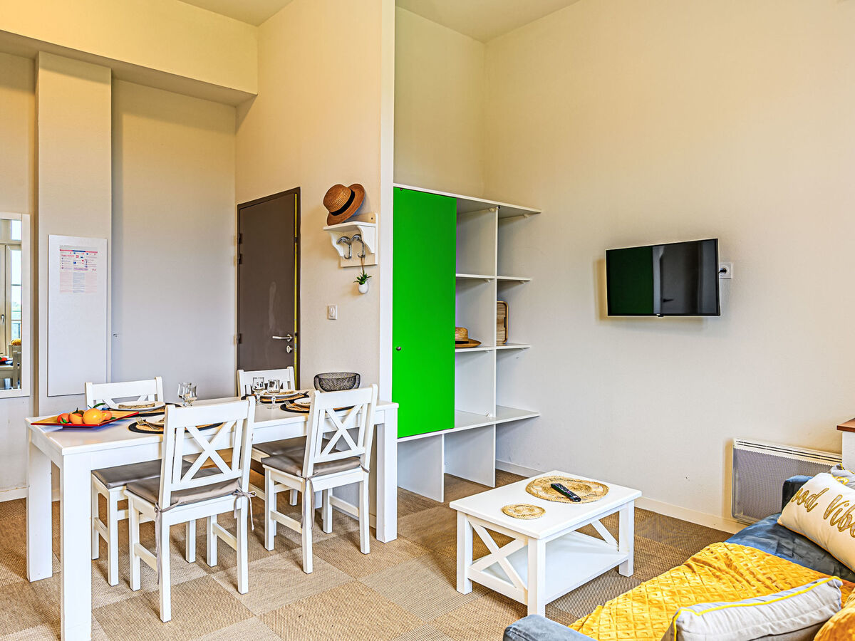 Aménagement fonctionnel et agréable: séjour/salle à manger avec 1 divan-lit double et TV (écran plat).