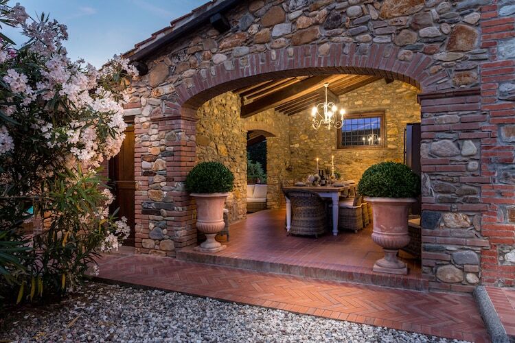 Plantes en pot et cyprès habillent élégamment cette demeure du XVIIIe siècle transformée, nichée dans la pittoresque campagne toscane. Des jardins luxuriants entourent une piscine étincelante dans cette ferme restaurée près de Lucques, située dans un village réputé pour sa fête des camélias et son huile d'olive extra vierge artisanale. La résidence a conservé son charme d'antan avec ses poutres apparentes, ses sols en briques et ses arcades, tandis qu'une loggia avec coin repas offre une vue imprenable depuis le sommet de la colline. Vous pourrez déguster des produits locaux dans une cuisine lumineuse, vous détendre dans un pool house en pierre (ancienne écurie) ou profiter d'activités de loisirs comme l'équitation, le tennis et le golf, à proximité.