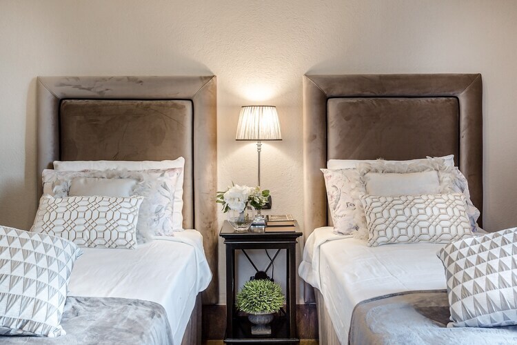 Le rez-de-chaussée comprend trois chambres doubles, trois salles de bains avec douches intégrées et un salon chaleureux avec télévision et portes-fenêtres donnant sur le jardin. Le rez-de-chaussée comprend une cuisine entièrement équipée, une salle à manger spacieuse pour douze convives, un autre salon avec télévision, deux chambres supplémentaires, dont une avec lits jumeaux, et une salle de bains. Chaque chambre est climatisée et dispose d'une connexion Wi-Fi fiable, de la télévision par satellite et d'un parking privé. L'emplacement offre un accès facile aux restaurants et boutiques à proximité.
