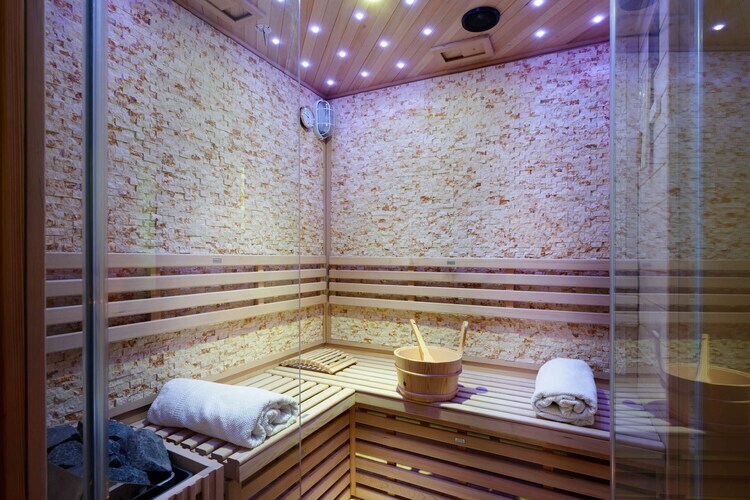 Rez-de-chaussée: (cuisine ouverte(bouilloire, grille-pain, cafetière/percolateur, four, micro ondes, lave-vaisselle , combinaison réfrigérateur/congélateur, Presse-agrumes, ), salle à manger-salon(TV(satellite), table, cheminée, coin salon, Lecteur DVD), chambre(lit simple, lit simple), salle de bains(douche)) Au 1er étage: (chambre(lit double), chambre(lit double), chambre(lit double), chambre avec salle de bains(lit double, baignoire), chambre avec salle de bains(lit double, douche), salle de bains(douche)) salle de fitness, Meubles de jardin, TV, TV, cheminée, sauna, lave-linge , balcon, chauffage(central), climatisation, terrasse, jardin, barbecue, parking, piscine(privé), fer à repasser, sèche-cheveux