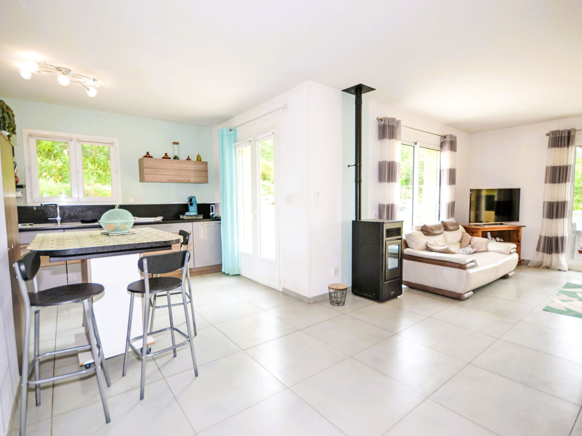Aménagement agréable: séjour/salle à manger 25 m2 avec poêle suédois et TV (écran plat), air-conditionné et volet roulant électrique.