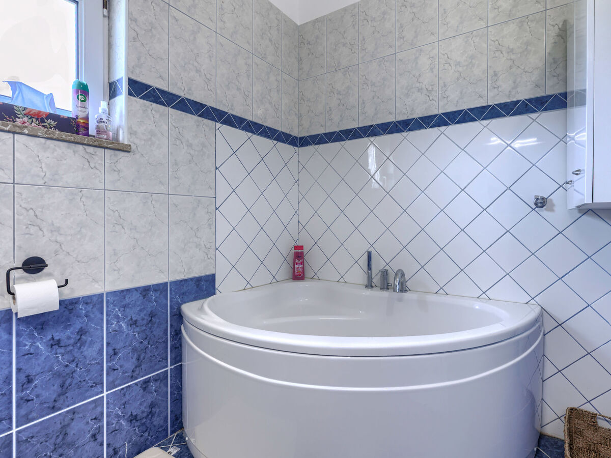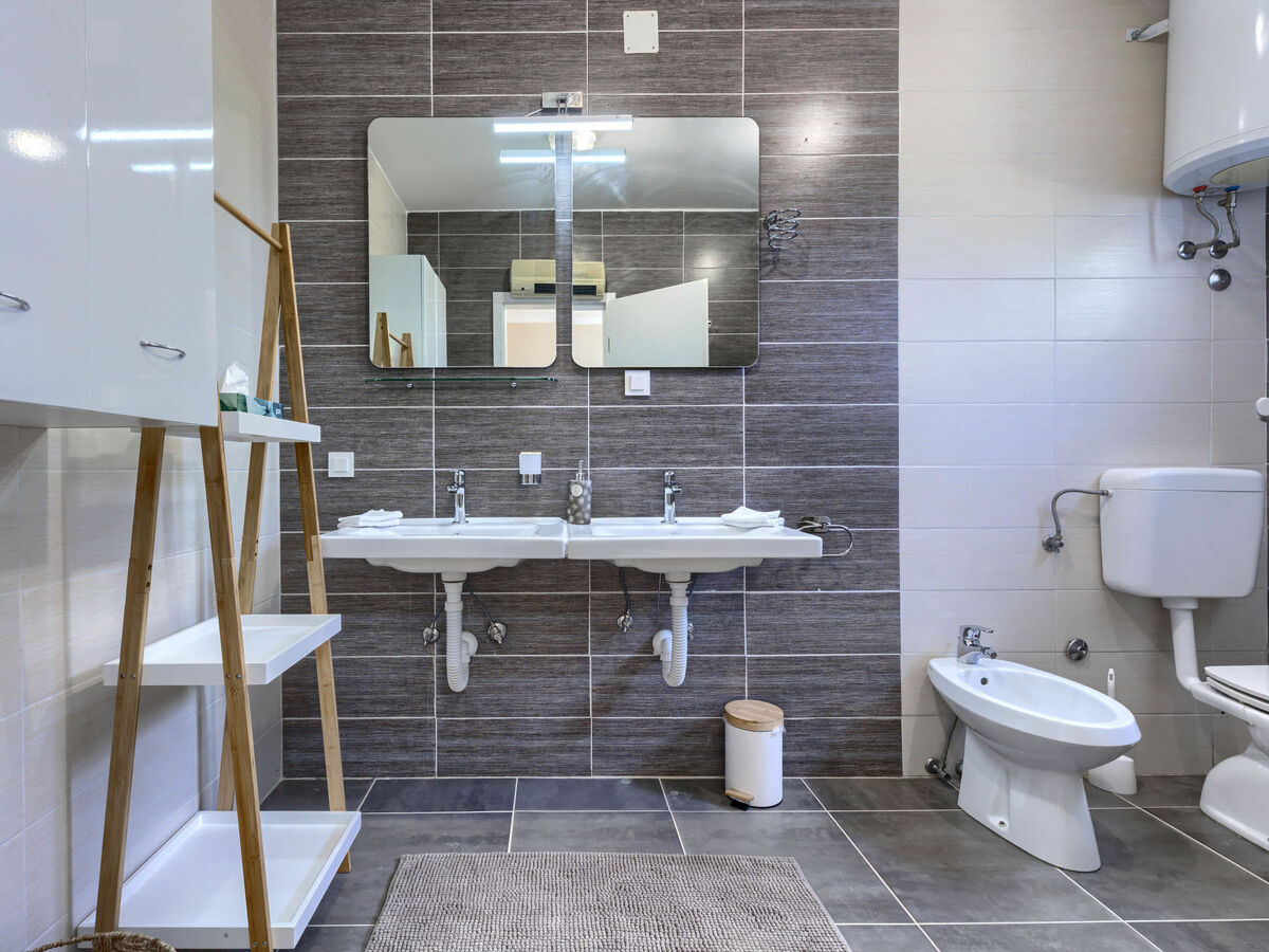 1 chambre avec 1 grand-lit (160 cm, longueur 200 cm), douche/bidet/WC, double vasque et ventilateur.