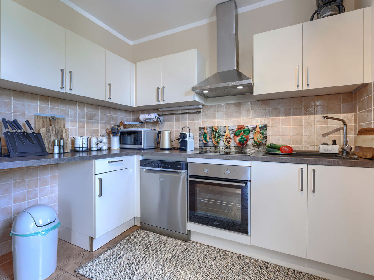 Cuisine ouverte (four, lave-vaisselle, 4 plaques à induction, grille-pain, bouilloire électrique, micro-ondes, congélateur, cafetière électrique).