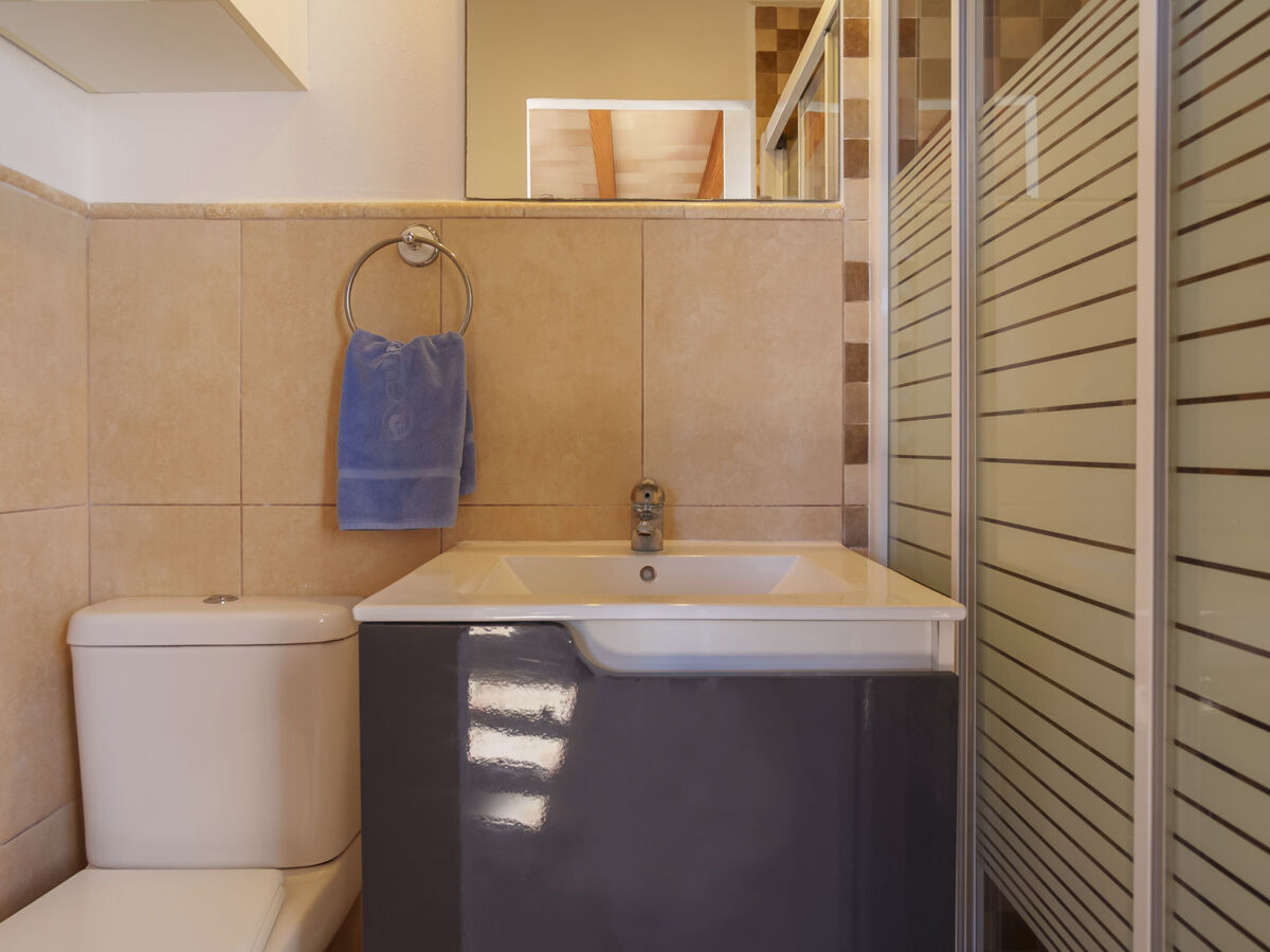 À l'étage supérieur: 1 grande chambre double avec baie vitrée avec 1 lit double (180 cm, longueur 200 cm), bain/douche/WC, TV, écran plat, air-conditionné et chauffage à air chaud.